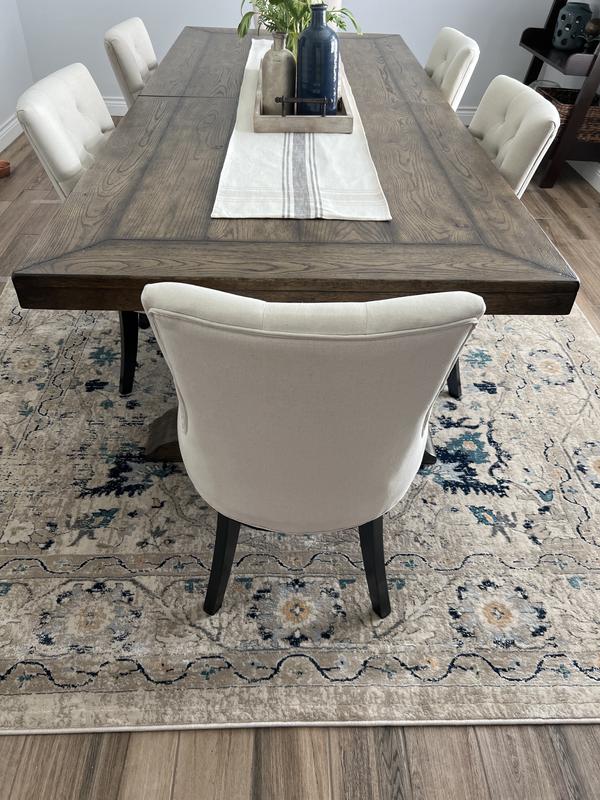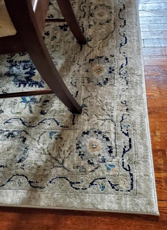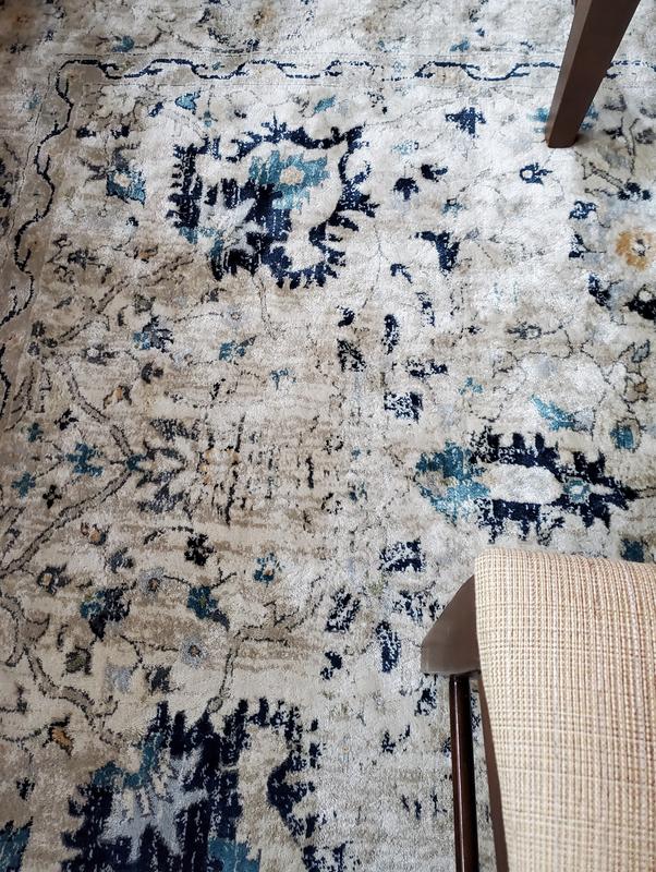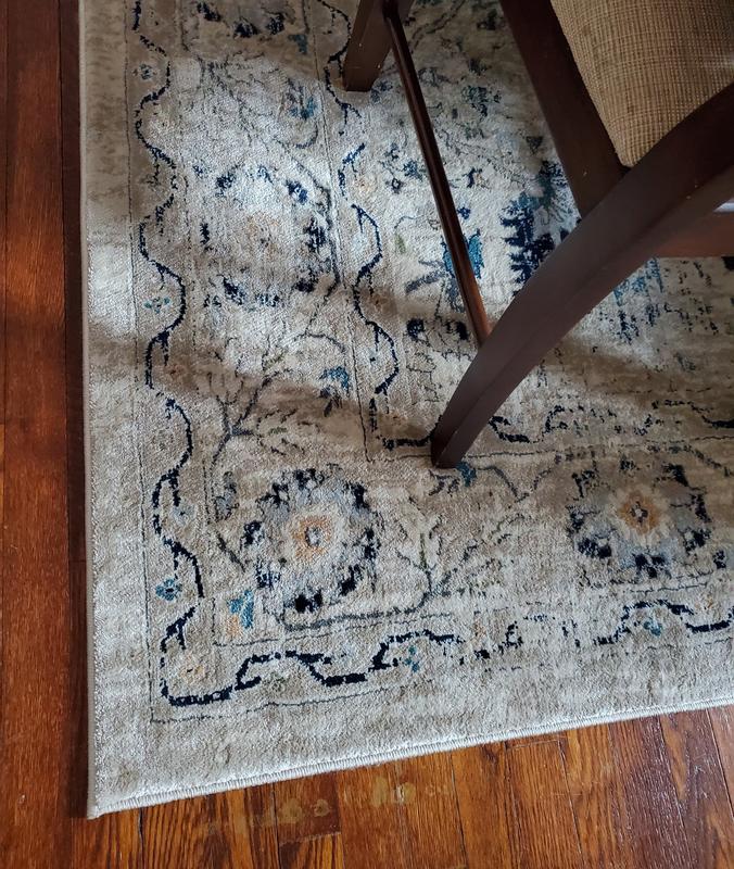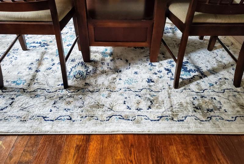I'm giving this four stars only because I believe I could have found a rug of this quality at a better price. It is pretty thin for what I paid. However, it is very pretty and it works out perfectly in the dining room. I have my dining table and chairs sitting on it and there is plenty of room for the chairs to sit on it. I do think I could have done better in terms of finding some very similar at a lower price - it should be a little thicker for paying more than $200. It's pretty enough to keep, however. It did come nicely rolled up and flattened out easily and delivery was quick.