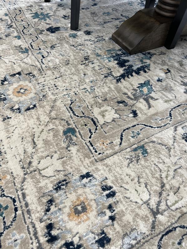 I am so happy with this purchase! The rug arrived quickly and it is just beautiful! It looks and feels like a quality rug. I would describe the main colors as beige, grey and cream. Accent colors are navy and turquoise and a bit of gold. Very pretty! Most of the creases from shipping came out within hours after laying it flat and it has relaxed nicely after a few days.