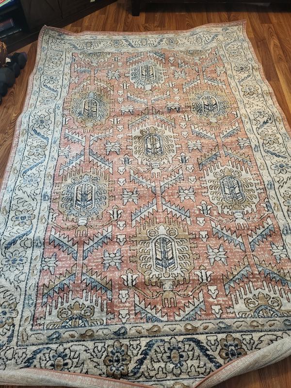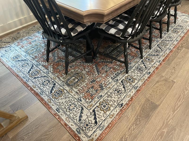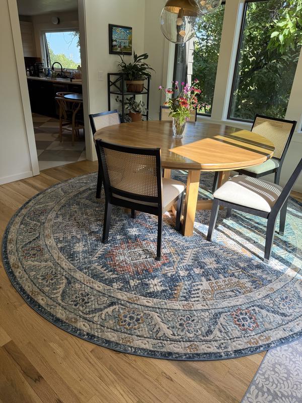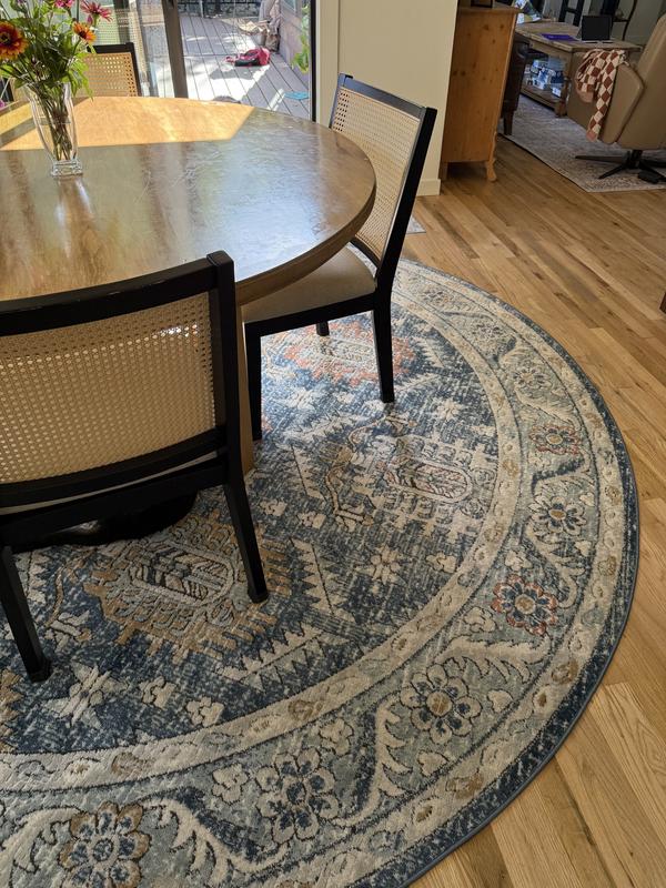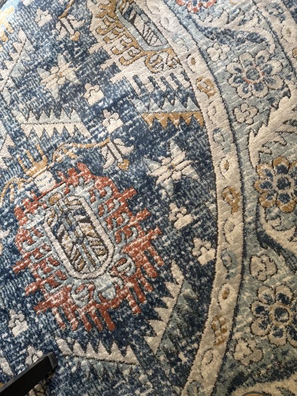 I have had a hard time finding a large round rug for my dining room. I crossed my fingers with this one and it has been a perfect fit for colors and size. The blue colors are brighter than they appear online, but the muted rust and gold/yellow and brown balance it well. It seems like it will hold up well to pets and foot traffic. I’m a huge fan of lololi rugs and this one seems similar to me. And the price is great for this size of rug and my budget.