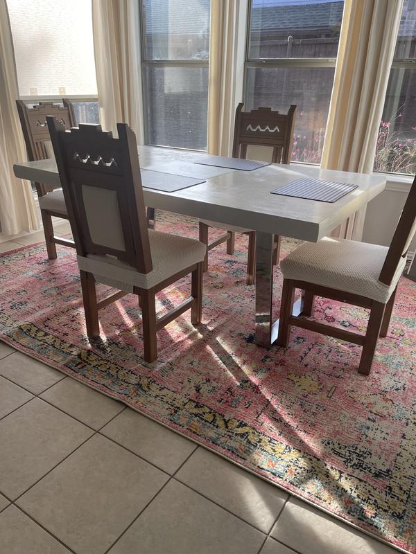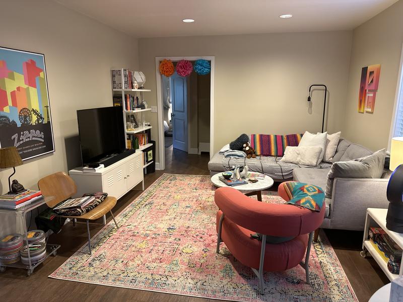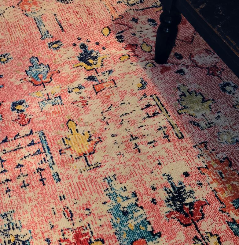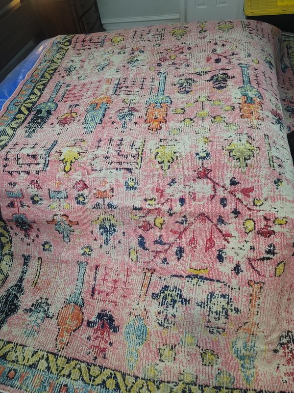 Great rug! I love it in my space - it’s a bit unusual but it’s what I needed to make the room pop! A couple of notes: pay attention to all photos for true color vibrancy. The main photo suggests the pink is very loud (which I wanted) but in reality the true pink is lighter-more in line with the up close images of the rug pile. Also the way they ship the rug is not my favorite. It comes folded in 1/3’s and then in half so be prepared to spend days flattening out the lumps, creases and edge curls. I’m on day 3 of it being rolled up in the opposite direction (their suggestion) so I pray this does the trick