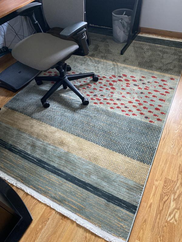 Absolutely love this rug. The colors are soft and muted except for the standout red. It is super soft for bare feet. Great quality. Using it in the middle of my art studio and the perfect piece to warm up the space.