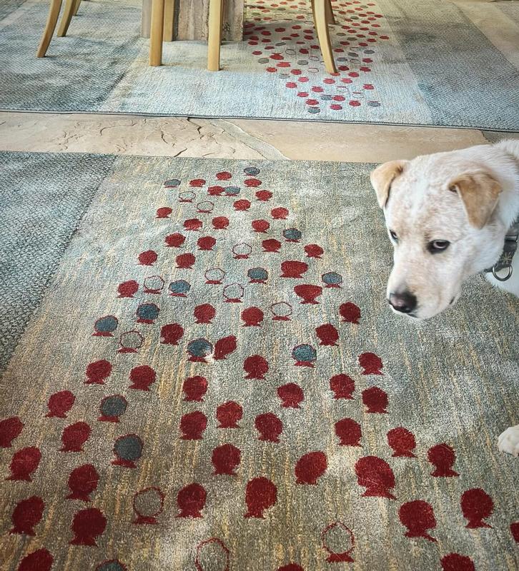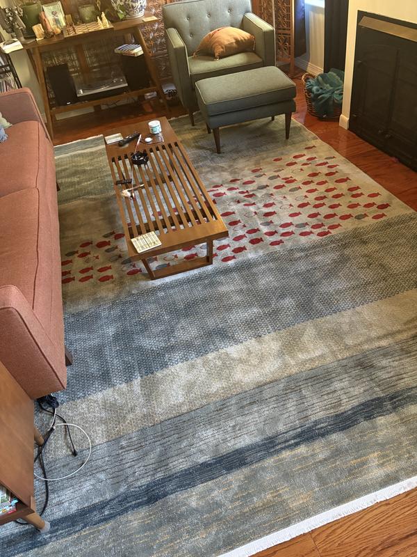 Love this rug. Such a great design. It goes well in my light room and the fish are the pop of color I need.