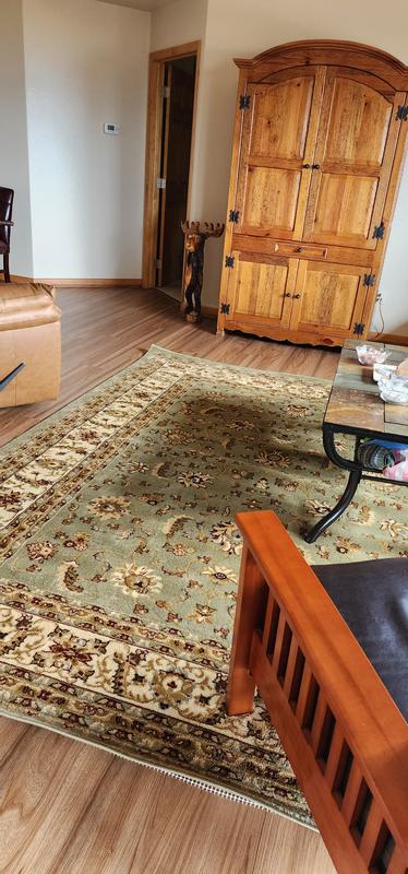 Great rug for my living room! I ordered the 8 by 10 for my living room and I am very happy with it. It came folded up and there were a few creases but after a few days they evened out. I also have a rug pad under it. I like love all the colors- especially the light blue in the middle. It goes well with my dark hard wood floors. It is soft and comfortable to sit and walk on.