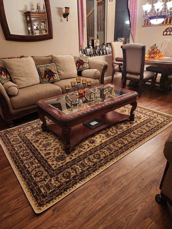 Great rug for my living room! I ordered the 8 by 10 for my living room and I am very happy with it. It came folded up and there were a few creases but after a few days they evened out. I also have a rug pad under it. I like love all the colors- especially the light blue in the middle. It goes well with my dark hard wood floors. It is soft and comfortable to sit and walk on.