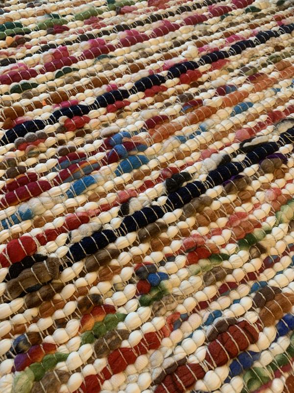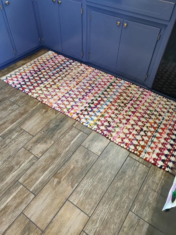 I bought an 8x10 of this rug about two months ago. I looks great in our living room, and I love the colors and the diamond pattern with the white background. It is soft and feels great underfoot. The viewing tool provided was spot on with how the rug would look in our room. The construction, while very pretty, is very loose, and the strands of rag fibers have loose ends that pop up and can get caught in the vacuum brushes. I keep the vacuum on the lowest suck setting. However, I have had to reweave some strands back into the rug since I bought it (I use a crochet hook). Also, if you have a pet, the strands are very tempting for those that like to pull things apart. So, pretty, bright, but perhaps not for everyone.
