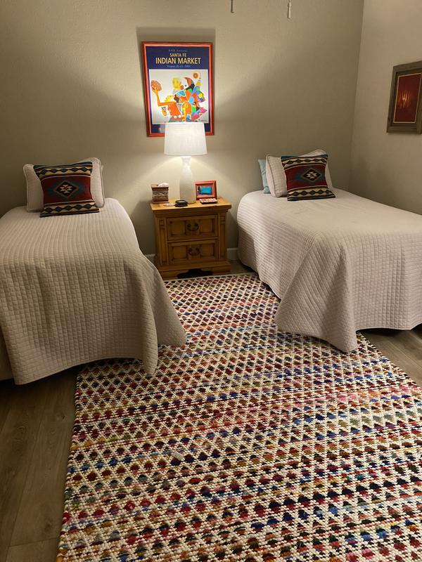 I bought an 8x10 of this rug about two months ago. I looks great in our living room, and I love the colors and the diamond pattern with the white background. It is soft and feels great underfoot. The viewing tool provided was spot on with how the rug would look in our room. The construction, while very pretty, is very loose, and the strands of rag fibers have loose ends that pop up and can get caught in the vacuum brushes. I keep the vacuum on the lowest suck setting. However, I have had to reweave some strands back into the rug since I bought it (I use a crochet hook). Also, if you have a pet, the strands are very tempting for those that like to pull things apart. So, pretty, bright, but perhaps not for everyone.