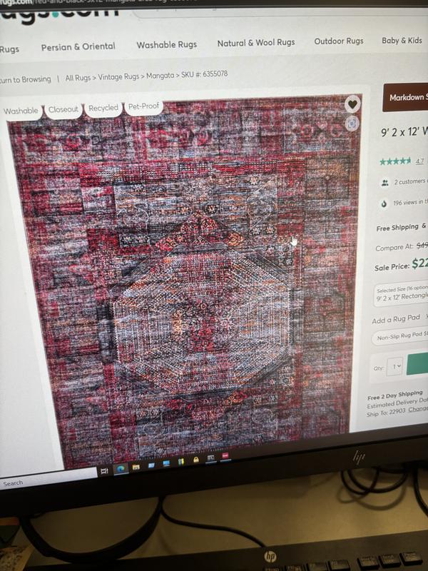 Love the rug! Great colors,abd WASHABLE- YAY! Was a little nervous ordering it sight unseen, but we love it! Was vetter than expected!
