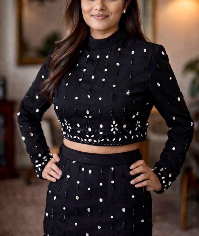 Beautiful dress with sequined embellishments. It drapes beautifully on the body. The construction is well made and it's comfortable to wear for long hours while it looks stunning. High quality materials and fabrics. I loved this outfit.