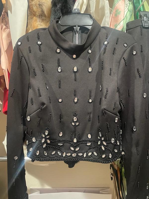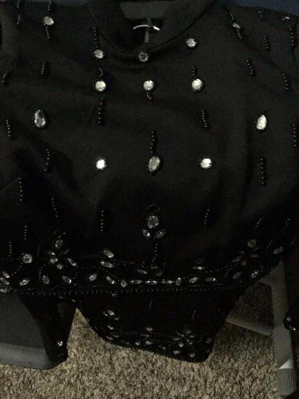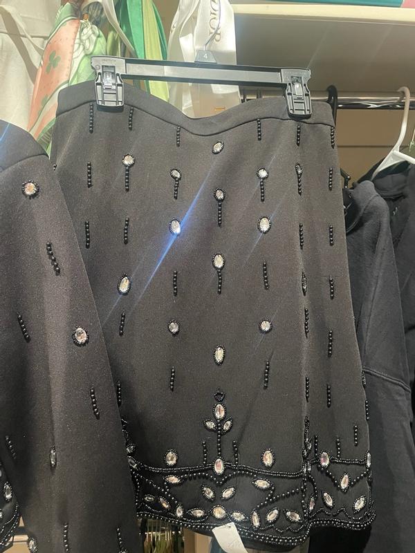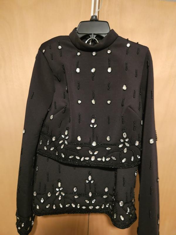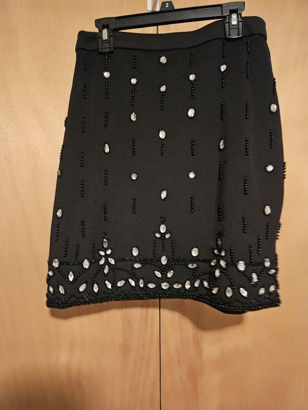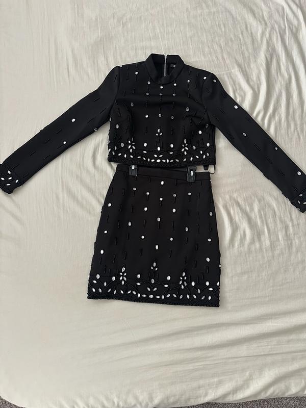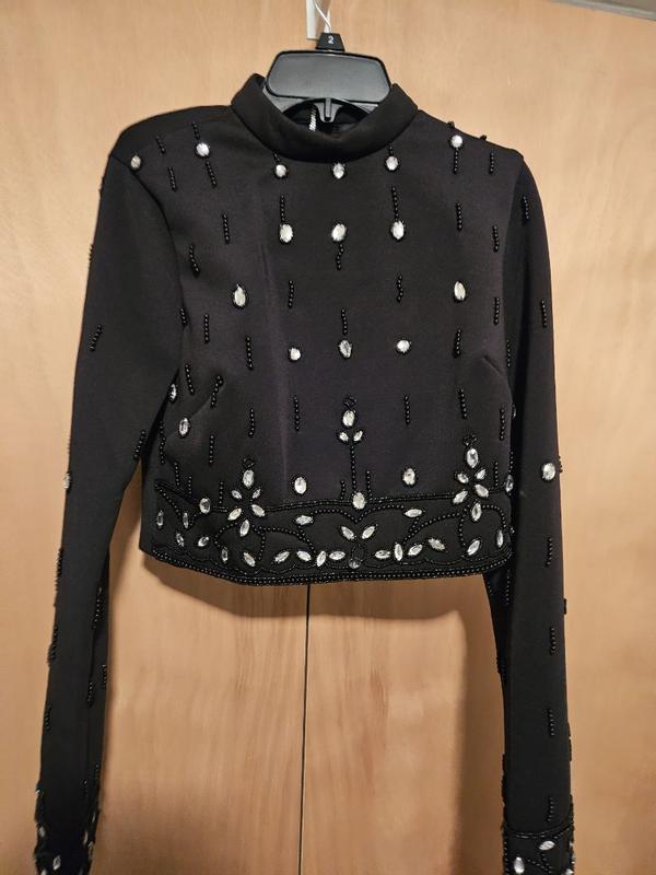 Wow. A stunning set that is great for a night out. I love the beaded details. This is a beautifully made piece. Has some weight to it. Well made. Two pieces. Zips in the back on the top and bottom. Wear together or separate for even more versatility. Comfortable, not itchy at all. Has a little stretch to it. Size 4 would fit a small 6 as well. In love with this set.