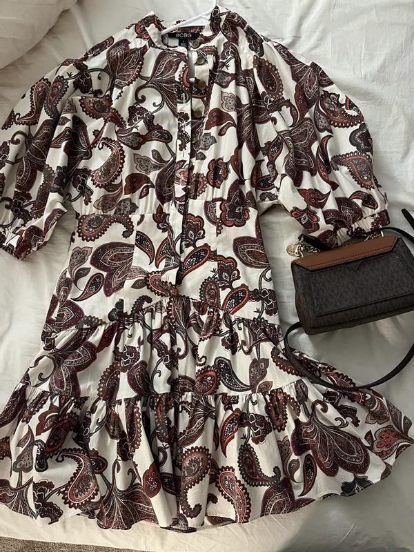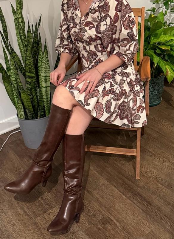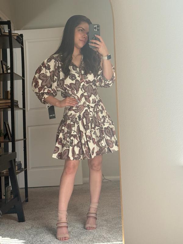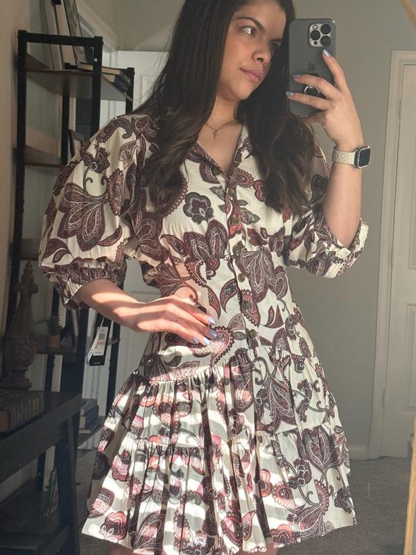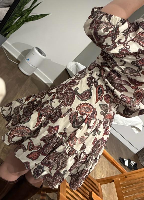 I recently got this dress as a gift and honestly, it’s even prettier in person than I expected. The print is gorgeous, very boho and elegant without feeling too busy. The fabric feels soft and comfortable, and I love the little ruffle detail at the hem; it gives the dress a really feminine look. The fit is flattering around the waist without being tight, and the puff sleeves add such a nice touch. I wore it with knee-high brown boots and the whole outfit looked so put-together and stylish. It’s the perfect day-to-night dress, cute enough for brunch but can be dressed up for dinner too. I already got compliments wearing it!