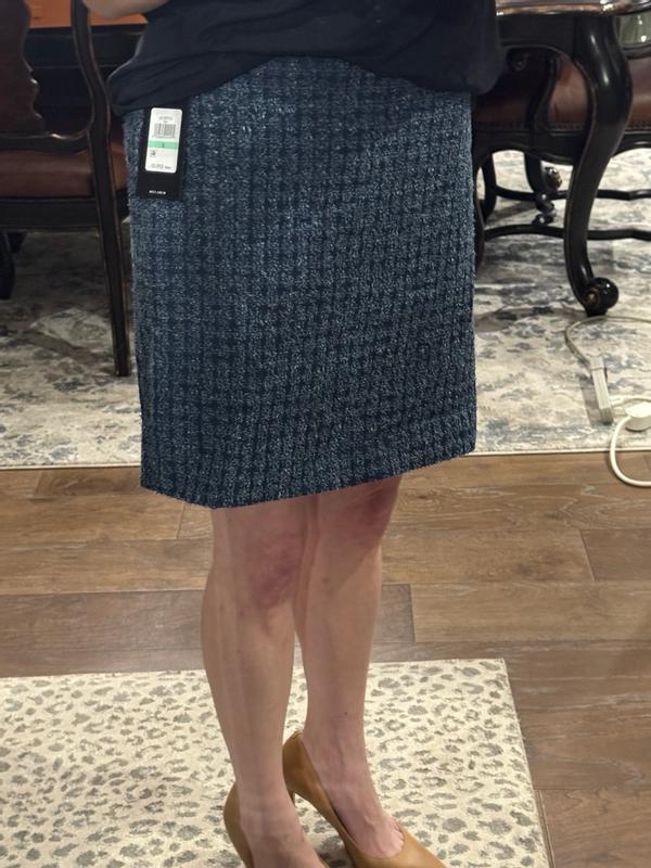 Love the texture and shape of this skirt. Perfect length and can be worn to work! You can dress this up with a blazer or down with a sweater. Great quality and sizing is true to size.