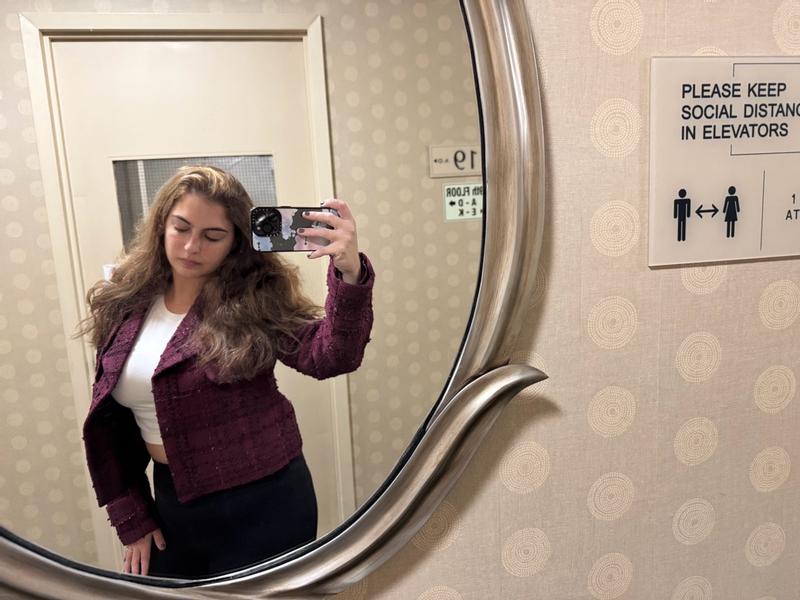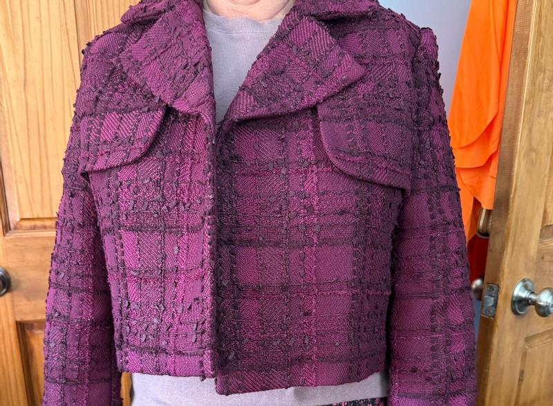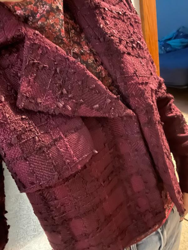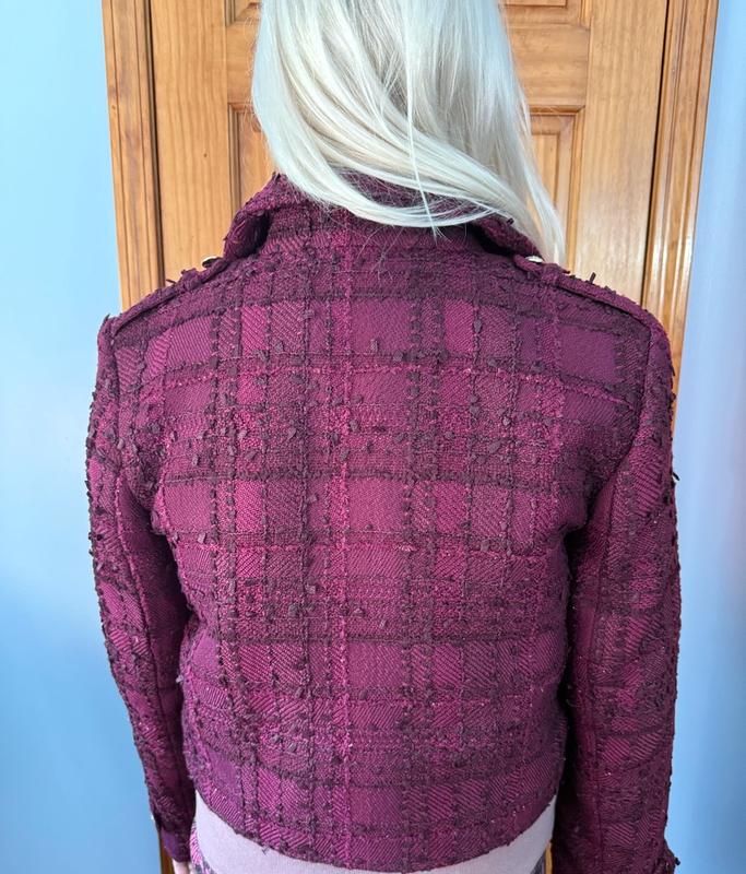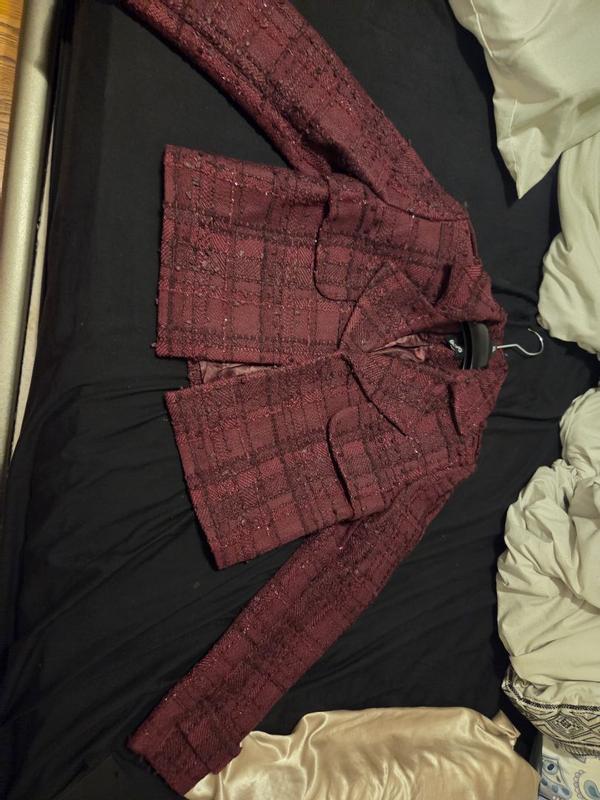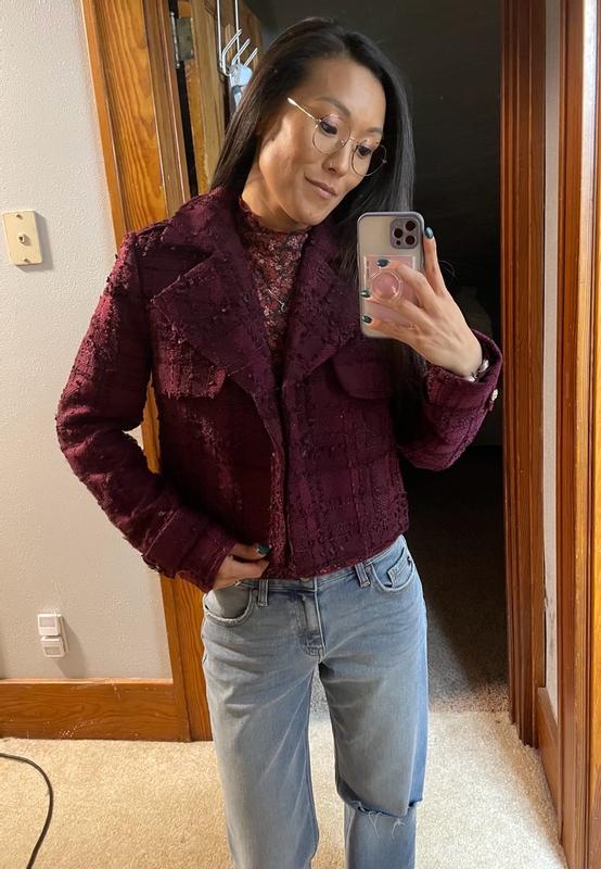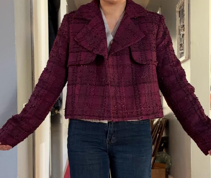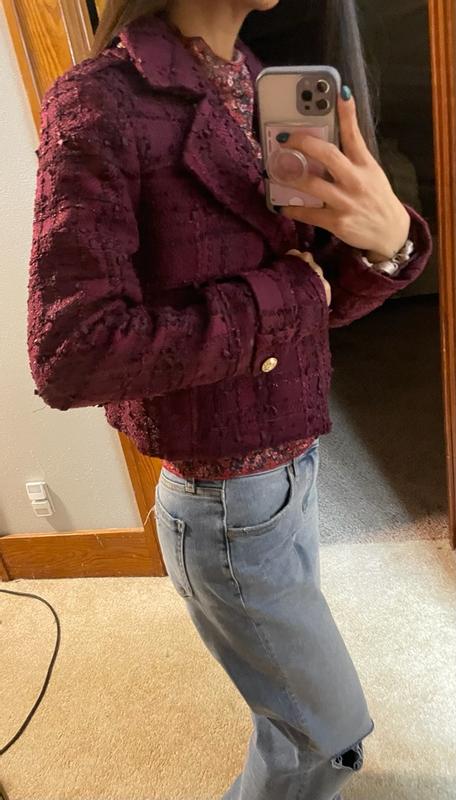 Overall the quality of this jacket is very nice. I do enjoy the fit of the jacket. I like the tailored look and that it’s cropped. I expected the color to be a maroon with more red tones but it’s actually a burgundy with more purple tones. One thing to note is the sizes do run very small. I would recommend going a whole size up. It’s a great little jacket to dress up an outfit for the evening.