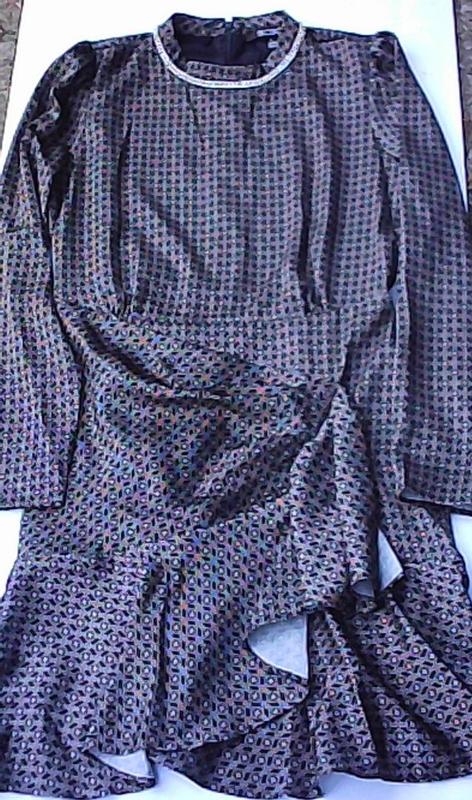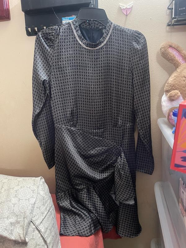 I am really impressed with this dress. I love the geometric pattern printed on it. It has a rhinestone-embellished collar. It is pleated in the front. It is gathered at the waist, making the dress look more interesting and modern. It fits well, and the fabric feels soft. This dress will make an impression every time you wear it.