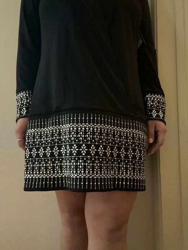 As a woman in my early 40s this is a fun stylish dress of good quality and thick weighted material. I was afraid the neckline would be too low but it shows just enough skin and I can always stick a camisole underneath. The silver bedazzlements dress it up without being overly gaudy. The long sleeves make it perfect for new year's eve out or a dressy dinner during the colder months. Very happy with my selection!