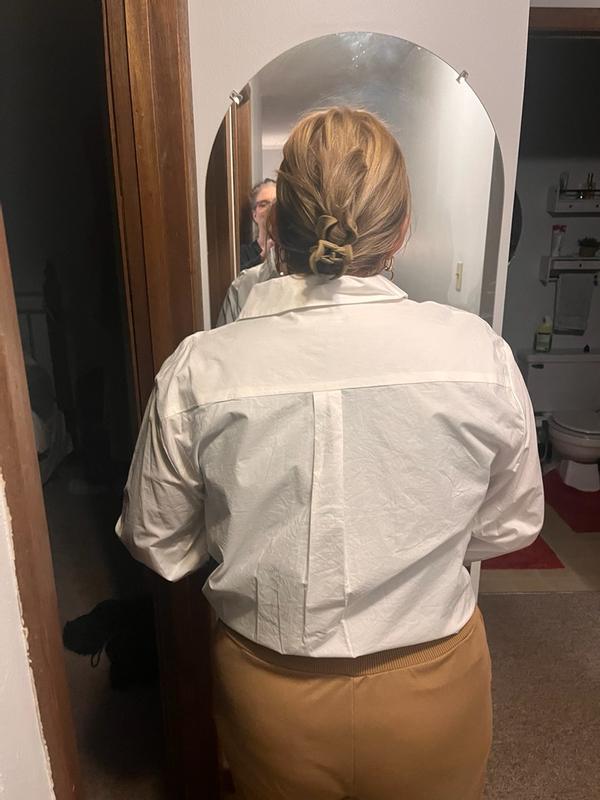 I was not a fan of this collared white shirt with flared sleeves. I felt like it was perfect for someone much older but not someone in the early 40s. The shirt was comfortable but it did not fit well. It was more wide than long. The texture was soft. It is not meant for someone with broad shoulders. The price point was on point for something I would purchase.