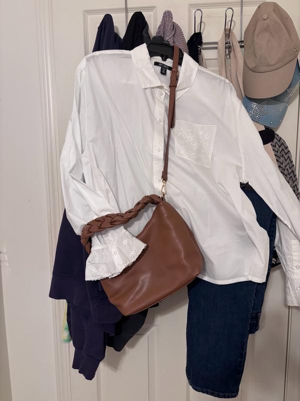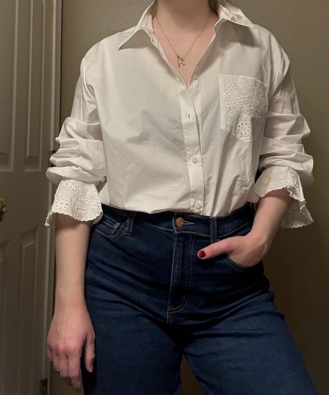 This white blouse with embroidery from BCBG is an updated classic in every way. I love a good white button down for the office, but sometimes it can look a bit too basic on its own. This blouse offers a good alternative where it’s still a classic look, but with a feminine edge built in through the sleeves and embroidery which elevates the classic white button up all on its own. I paired it with a red purse, classic jeans, and tucked it in. The size feels appropriate. I’m a size 4 and the small fit well (photos for size and fit). Overall, I’m very happy with it and I’d order it again!