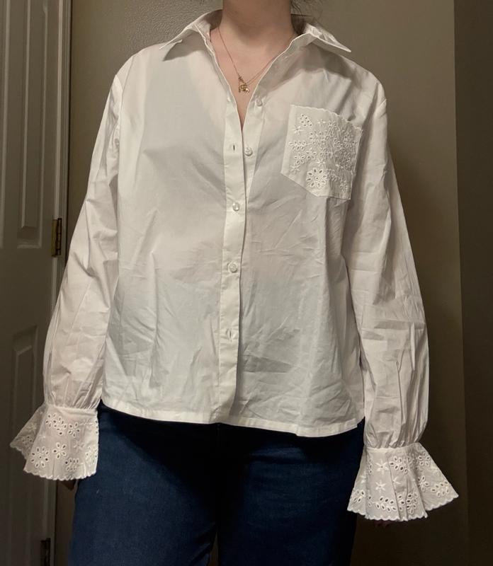 I’m actually obsessed with this blouse. The fabric has that smooth, slightly structured texture that feels way more expensive than it is, and the stitching is super clean, nothing loose or weird anywhere. The embroidered pocket and the little pattern on the sleeve cuffs are seriously the cutest details. They make the shirt look elevated without trying too hard. Fit-wise, it’s relaxed but still flattering. It has that “effortlessly put together” vibe, not boxy or stiff. I’d say the sizing runs pretty true, roomy enough to tuck in comfortably but not oversized to the point where you’re swimming in it. And it wears really well throughout the day; it doesn’t wrinkle like crazy or lose its shape. Overall, it’s one of those tops you can throw on with jeans or dress pants and instantly look polished. Definitely a good find.