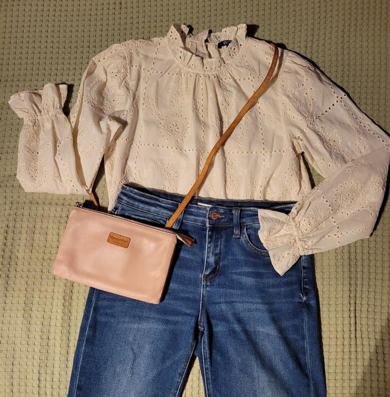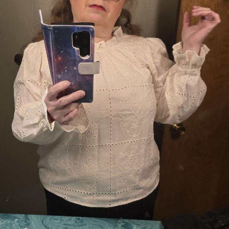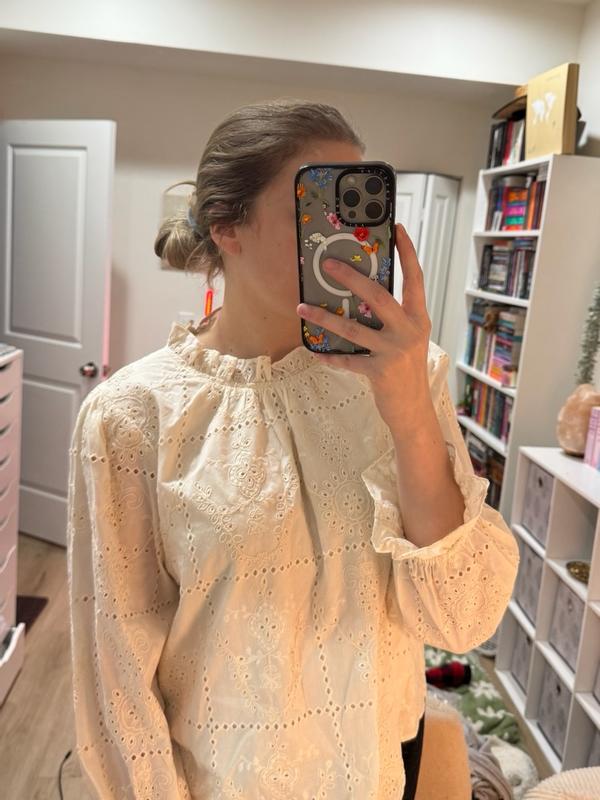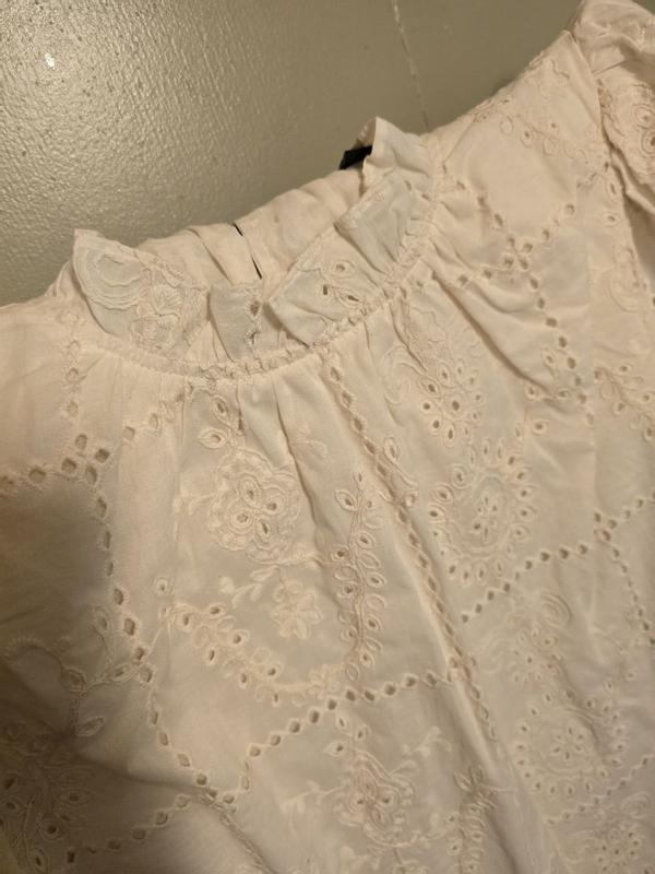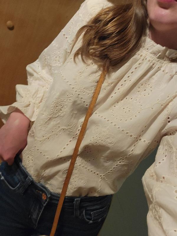 I was initially on the fence about wearing this blouse when it arrived. It felt like church attire rather than something I could throw on for the office. That being said, I paired it with some solid brown jeans for work today and I immediately got a compliment when I walked in! The blouse feels classy and light. The eyelet pattern is not something I would usually reach for but it’s honestly beautiful and feminine. The white/cream color I received pairs well with heels and some gold jewelry. My only minor issue is that some threads are already showing on the sleeves, overall it does seem high-quality and I’m happy to add it to my closet for workwear!