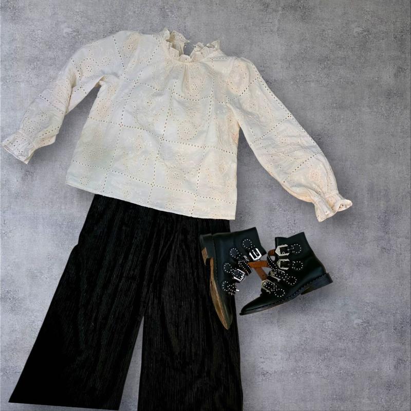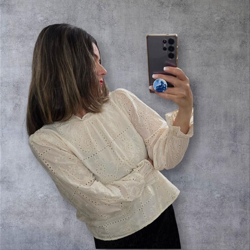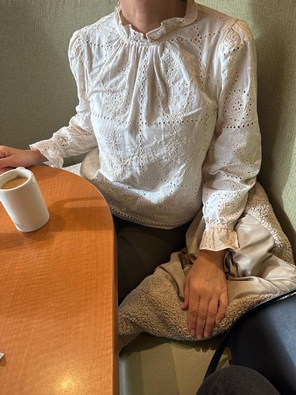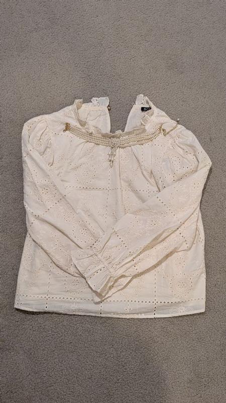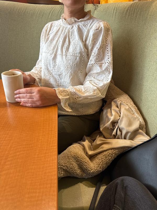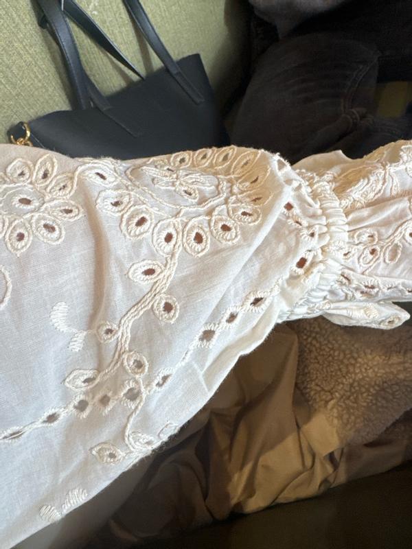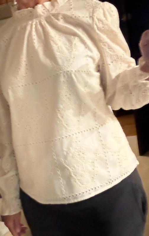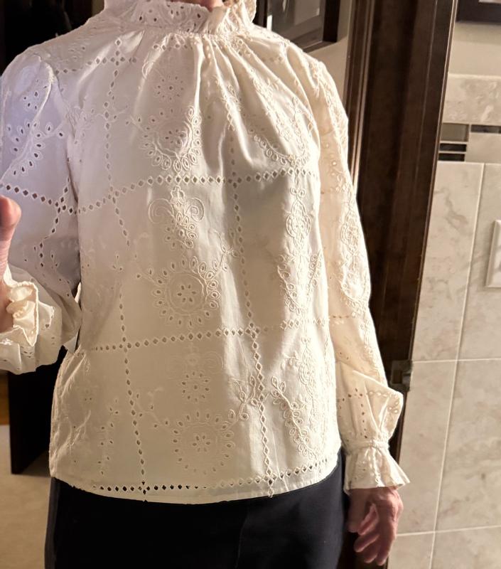 Absolutely beautiful eyelet patterned, timeless blouse! Very versatile, can be dressed up or dressed down. Very comfy and flowy. Fits great, true to size. Also very feminine and flattering. Off white color goes well with anything. Came elegantly packaged in a box on a hanger. Very impressive quality. Clearly a luxury brand. I love this shirt and have received several compliments and inquiries on where to buy. I hand washed, per instructions and air dried…it came out great. Recommended!