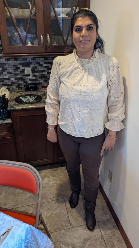 I absolutely love this BCBG Long Square Eyelet Pattern top! It’s so graceful and charming — the high neckline and elegant long sleeves give it such a refined look, while the eyelet pattern adds the perfect touch of frilly, girly detail. I’ve gotten so many compliments every time I wear it! It fits true to size, though I did notice it runs just a little shorter in length than expected. The center back keyhole with the button detail is a lovely touch, and the pull-on style makes it super easy to wear. Overall, it’s a beautiful, feminine piece that makes me feel confident and stylish. Highly recommend!