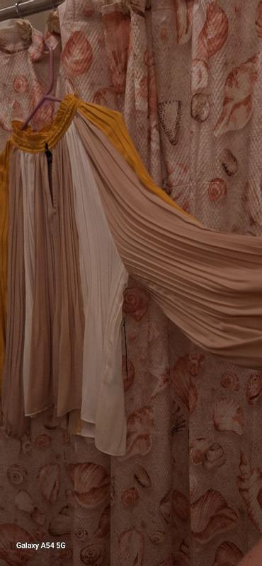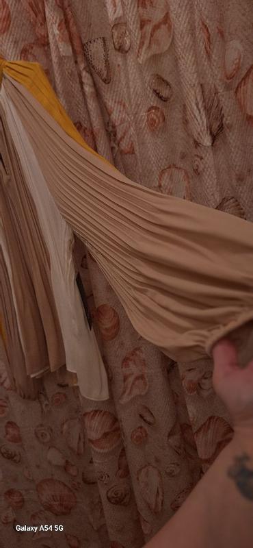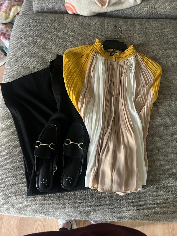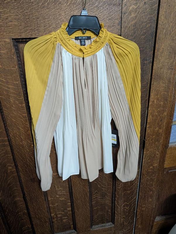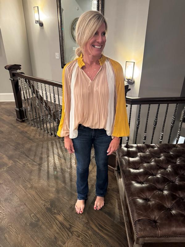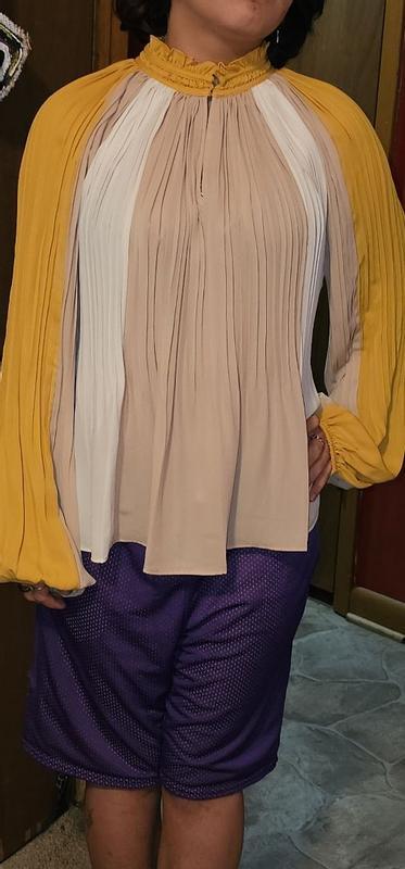 The top is so pretty and flows with you when walking. The colors match with so many things in my closet . True to size. Just hoping the pleats don’t disappear .