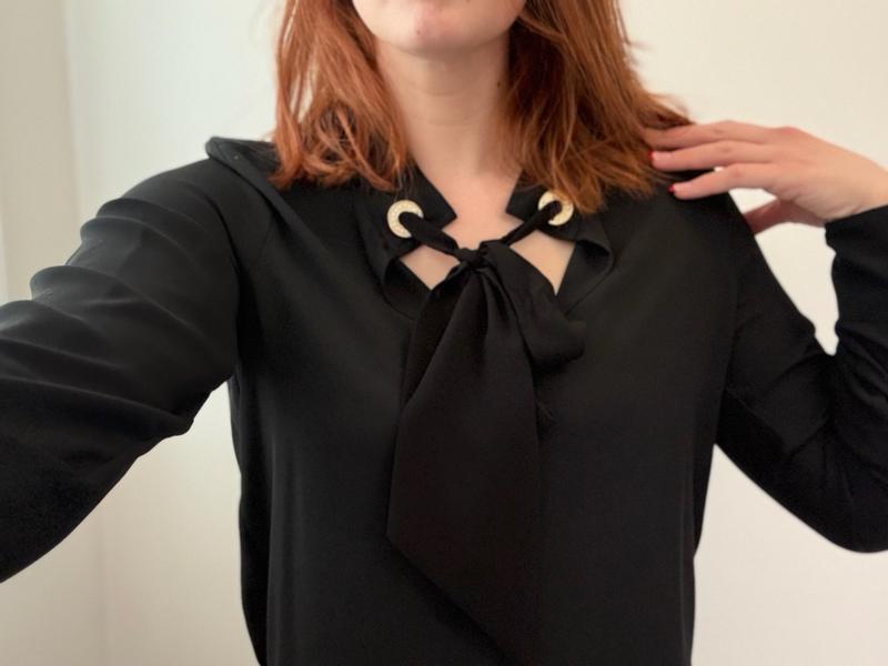 This top is so well-made it feels like luxury. I love the soft texture. The neck line is so adorable. It puts my whole outfit together. It makes it easy to either dress it up or dress it down for business casual. It’s so lightweight and doesn’t make me overheat like other shirts with this material do. The fastening on it isn’t tight at all. It fits perfect without being loose.