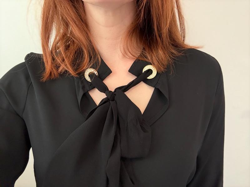 Love this top from BCBG Max Azria. It’s very classy and the fabric is stunning. It can be paired with daytime and/or nighttime attire. The fabric is a flowing sliky fiber and it fits true to size. Love the charismatic touches on the blouse, such as the bow and fasteners. It is a great choice anytime of the day.