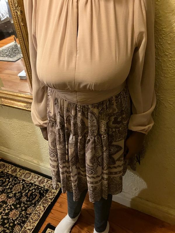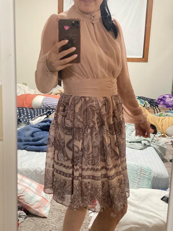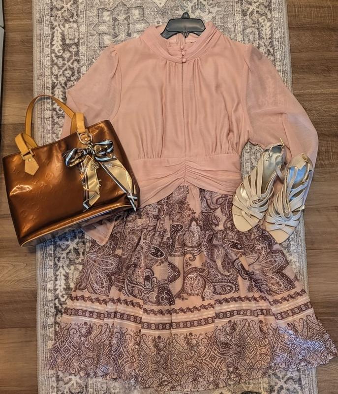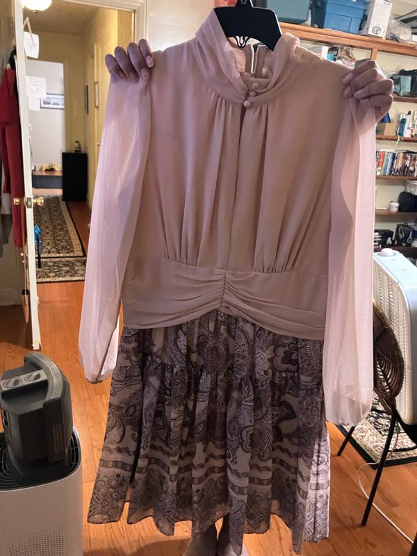 I was so excited that this gorgeous dress was available in my size! And it's also not frumpy or shapeless. Very impressed with the quality, especially the lining under the sheer fabric. The sleeves, however, are sheer and just so pretty! I love the button detail at the neck and the pleated fabric at the waist. It hits me just above the knee (I'm 5'9") and the flowy skirt is just beautiful. I paired it with some strappy nude heels and a bronze vintage Houston bag. I'm taking this dress with me during my next travel week to my employer and can't wait to wear it out to dinner!