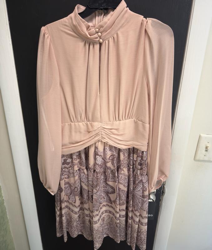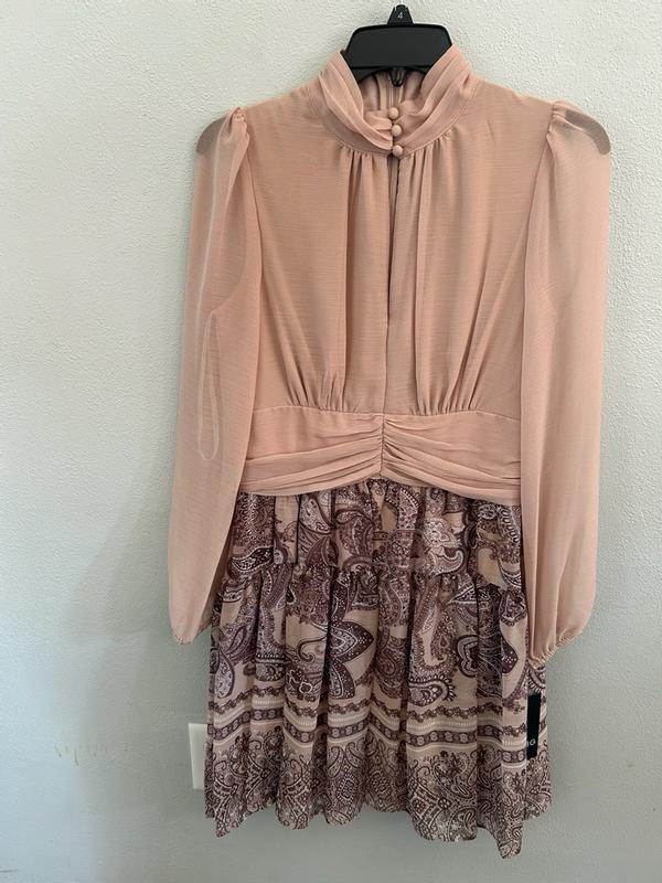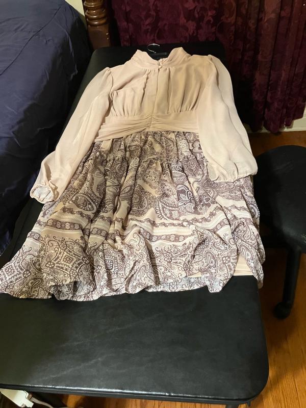 I really love this dress! The soft blush color is so pretty and gives a gentle, feminine look. The top part feels elegant with the high neck and slight puff sleeves, while the patterned skirt adds just the right amount of detail. It fits nicely at the waist without feeling tight, and the fabric is light and comfortable. You can wear it with sneakers for a cute everyday look or dress it up with heels. Overall, it’s stylish, flattering, and super easy to wear.