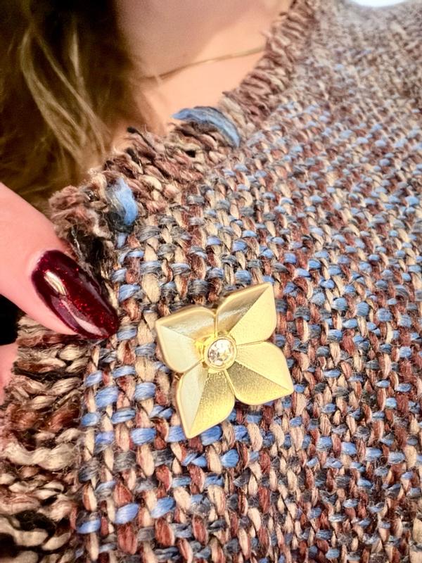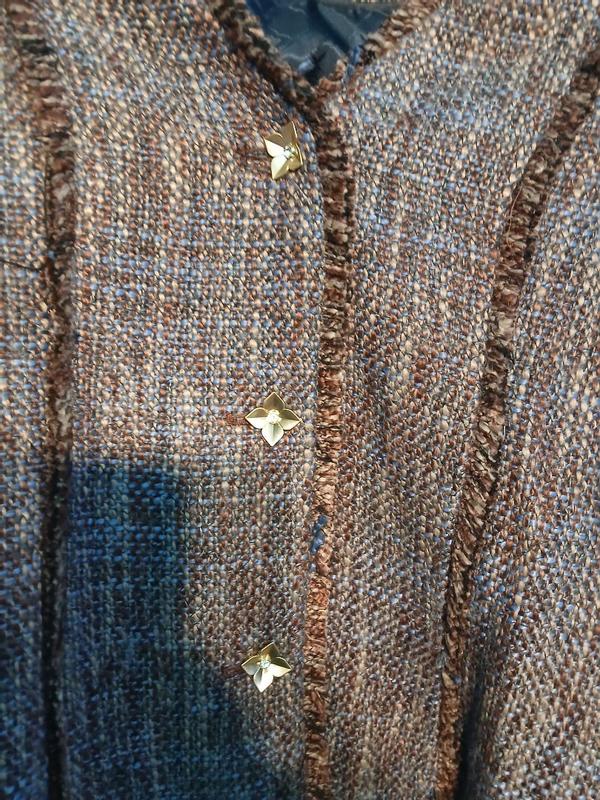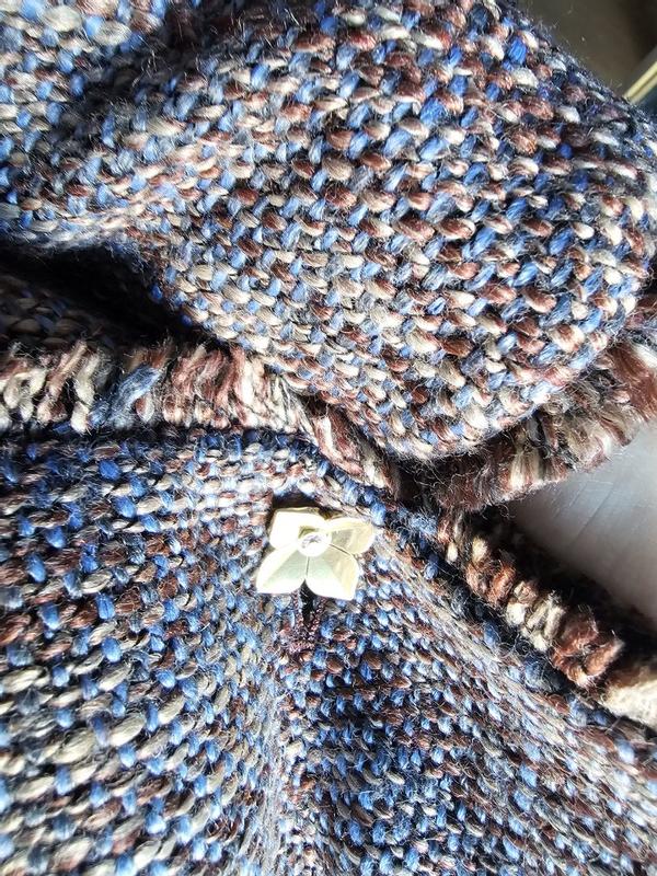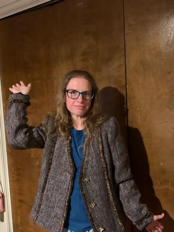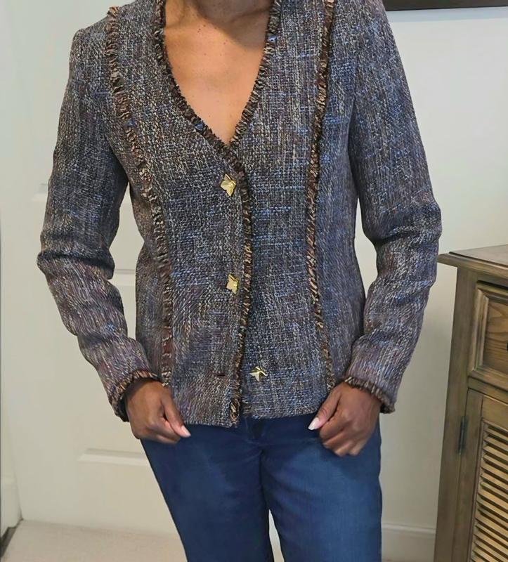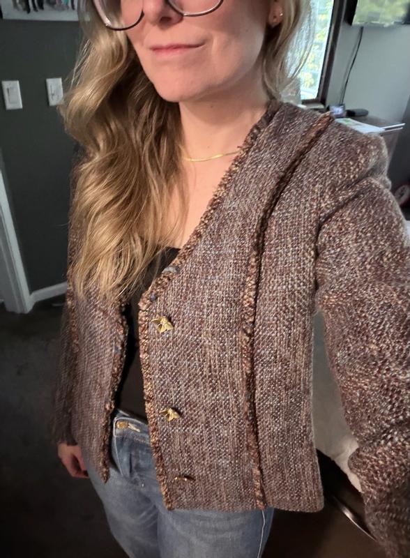 This is such a lovely jacket! The colors are so pretty, and it goes with so many things because of the multicolored fabric! I'm a little hippie so it doesn't lay as flat as it does on the model. It looked a little better when I unbuttoned the bottom button, so it didn't bunch up on the side. The length of the sleeves is perfect. Beautiful details on the trim. The buttons are a little finicky because of the points on the petals. All in all, it's a beautiful piece that can dress up a pair of jeans or make a fancy pair of slacks more casual.