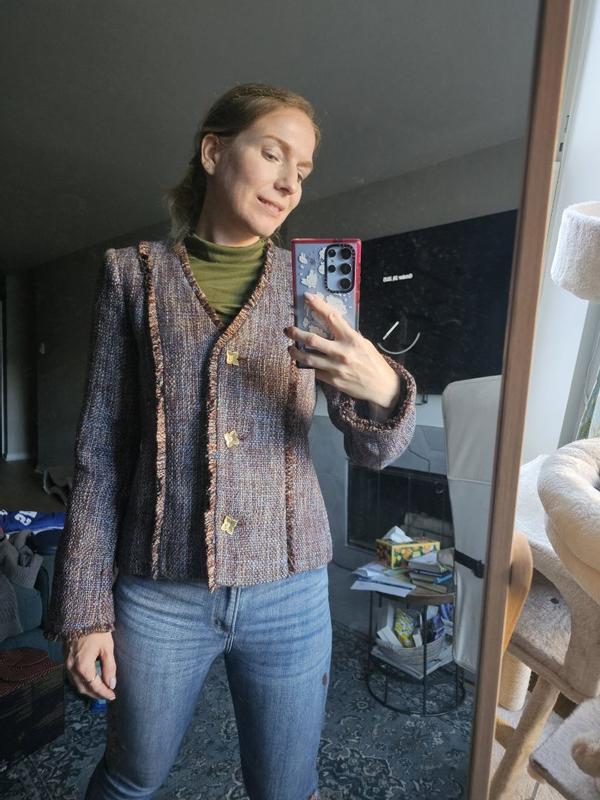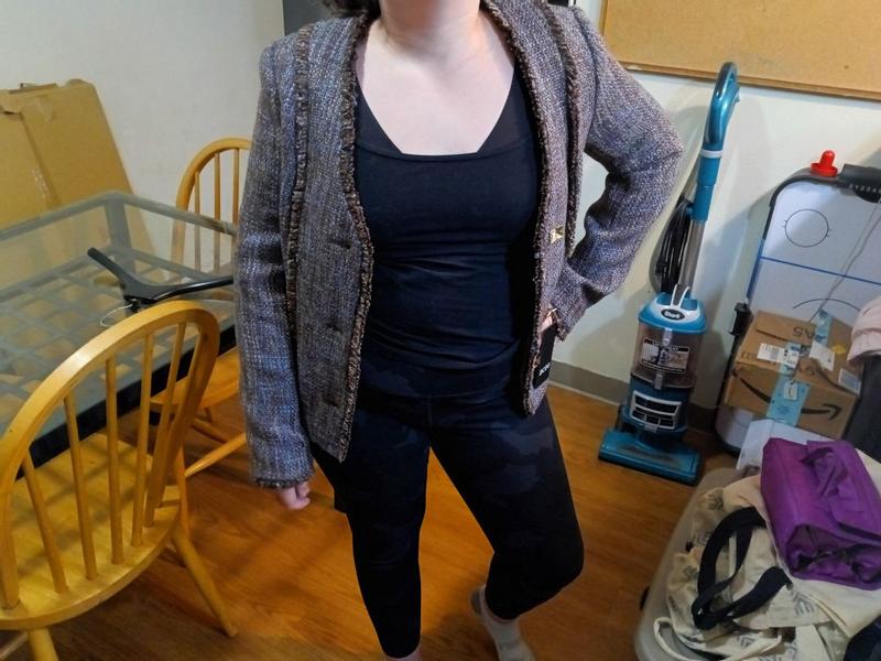 Love this jacket ! Super cute colors for fall and fits perfectly. Slimmer at the waist so it kind of gives me an hour glass illusion when the middle button is done. Gorgeous, thick fabric.