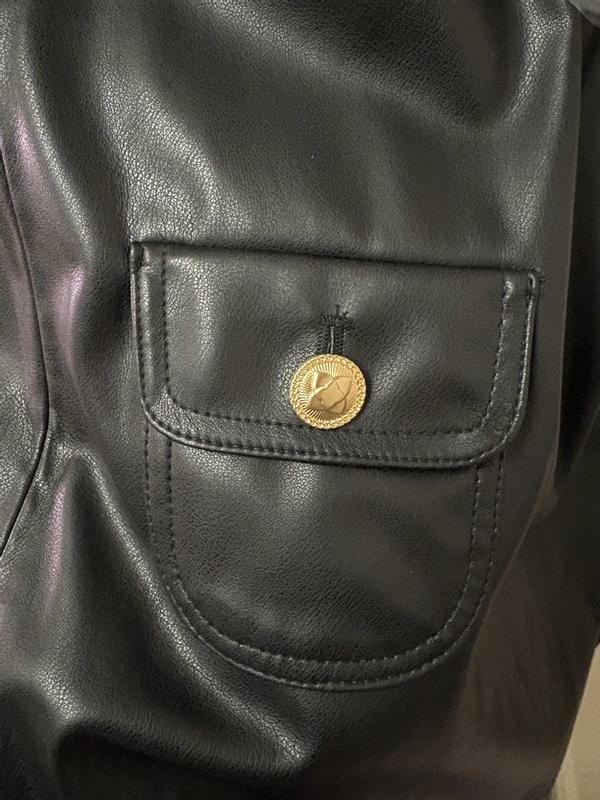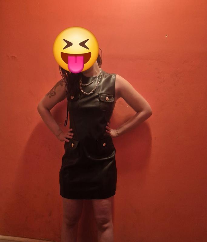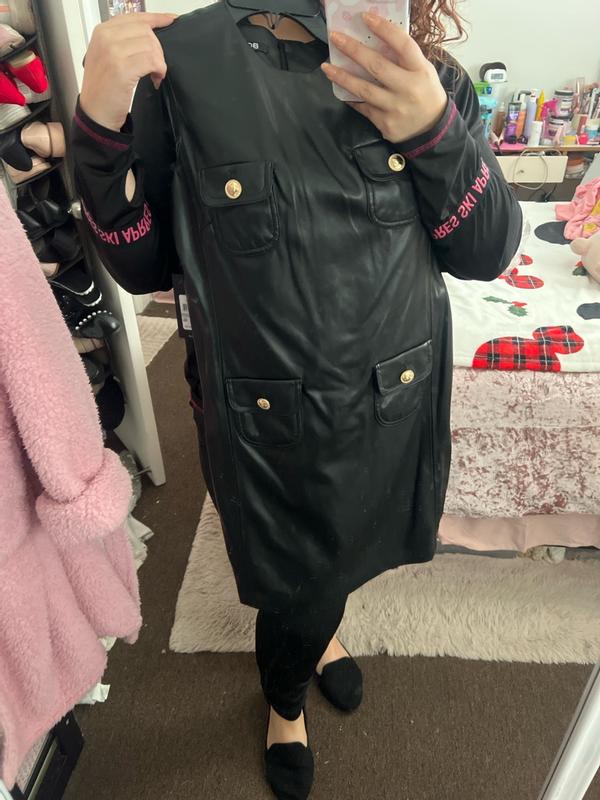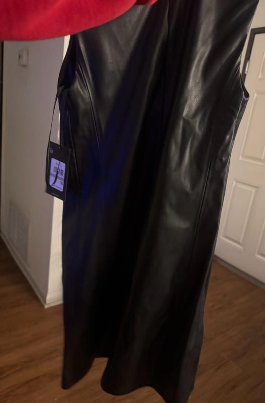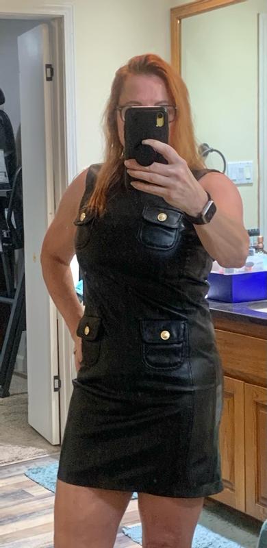 I really like this dress and have already worn it a few times. The A-line shape is flattering and easy to throw on, and the weight feels good — not flimsy or stiff. The pockets are actually usable, which I appreciate, and the length works well with boots or flats. My only hesitation is the material. From far away it looks great, but up close it doesn’t fully pass for real leather and has a more obvious faux look. It’s not a dealbreaker, just something to note if you’re expecting it to look exactly like leather. Overall still a solid, wearable piece.