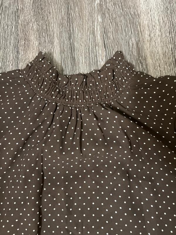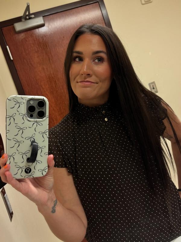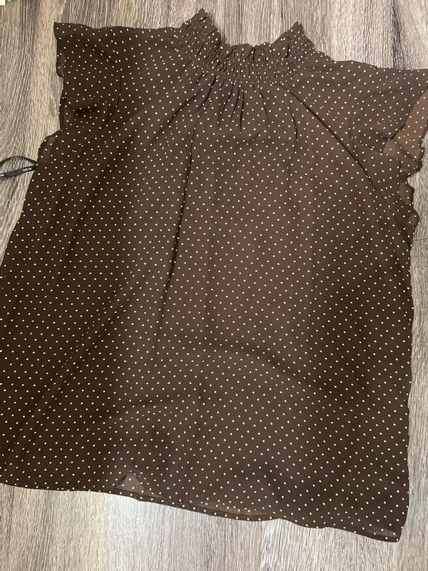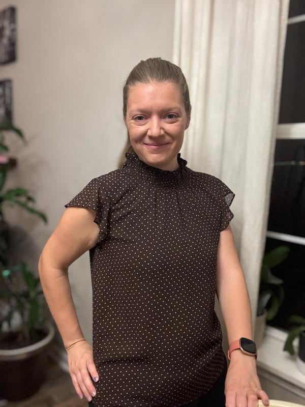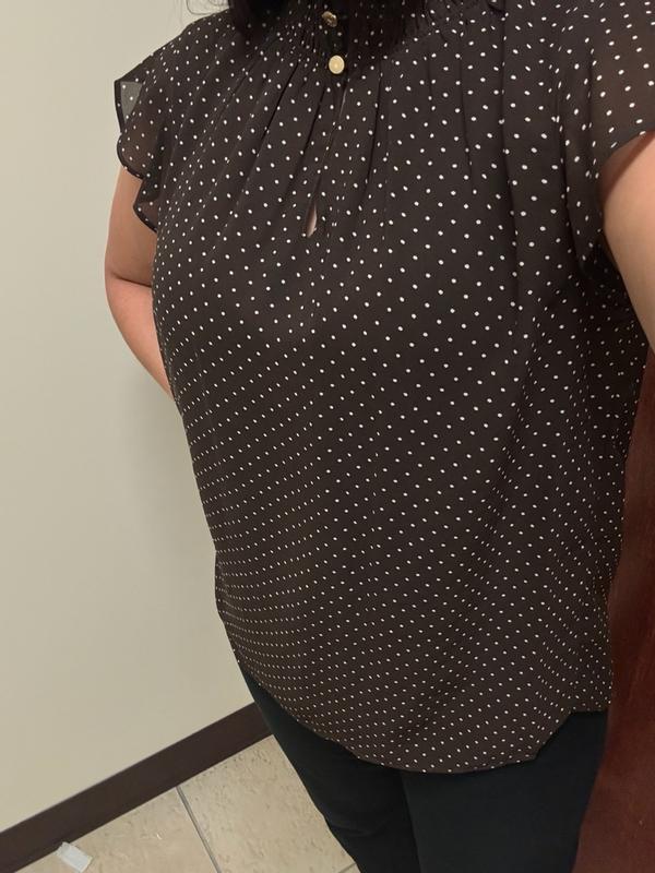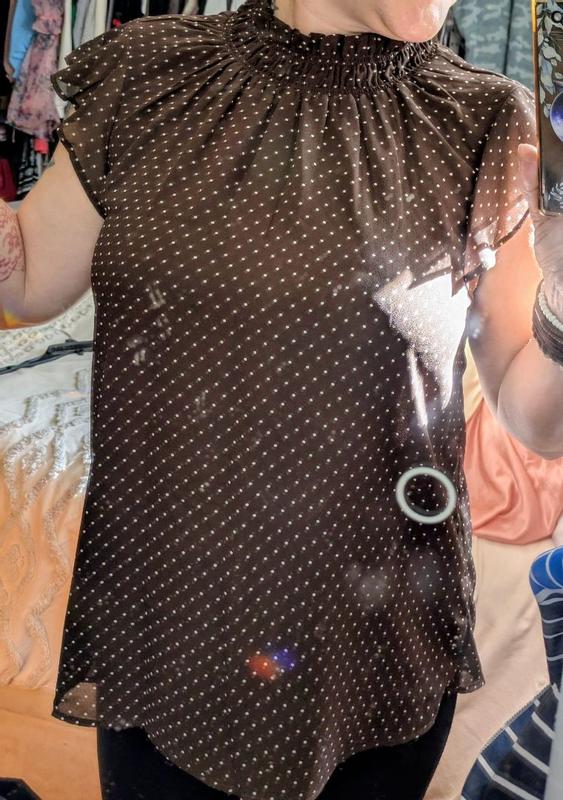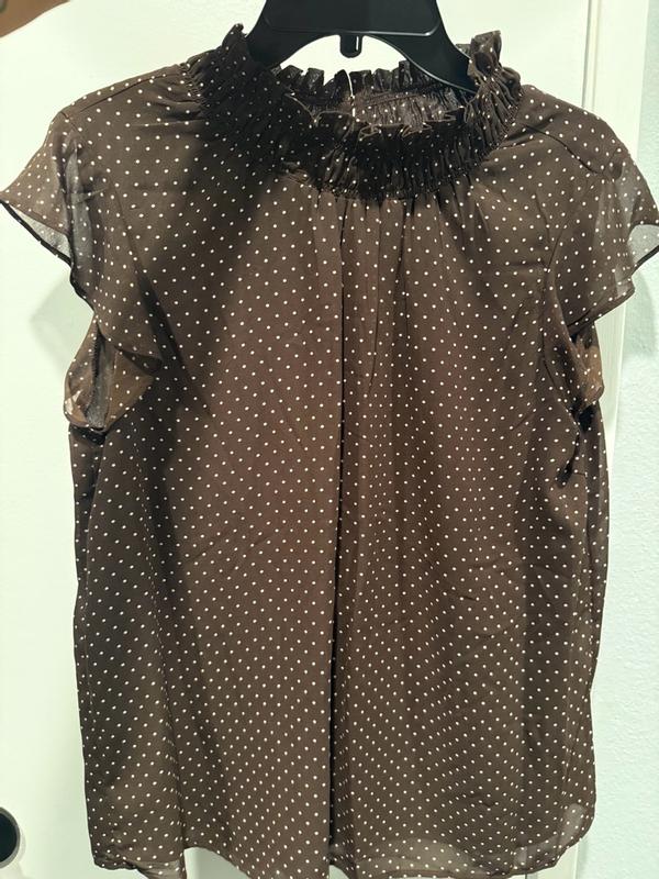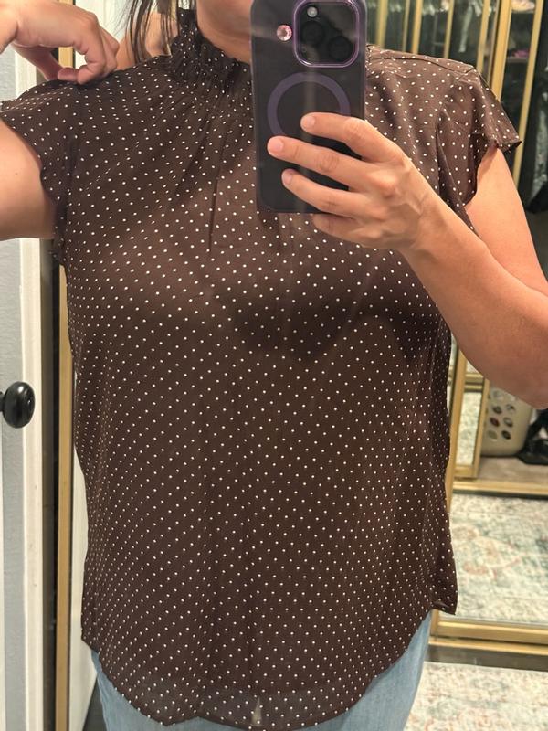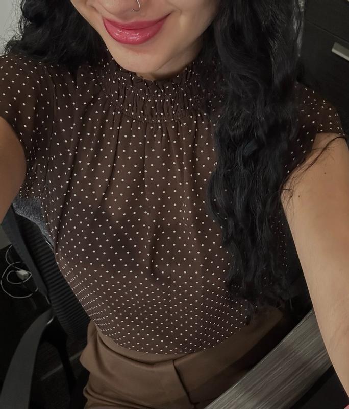 This blouse is really pretty and easy to wear. The mock neck and cap sleeves give it a polished look without feeling too dressy. The fabric feels lightweight and comfortable, and the polka dot print is a cute touch that works for both casual and work outfits. A simple, stylish piece you can grab for anything.