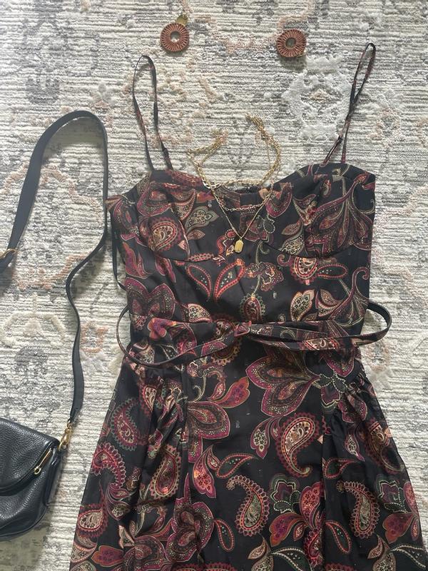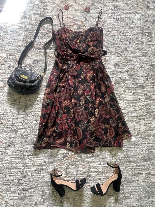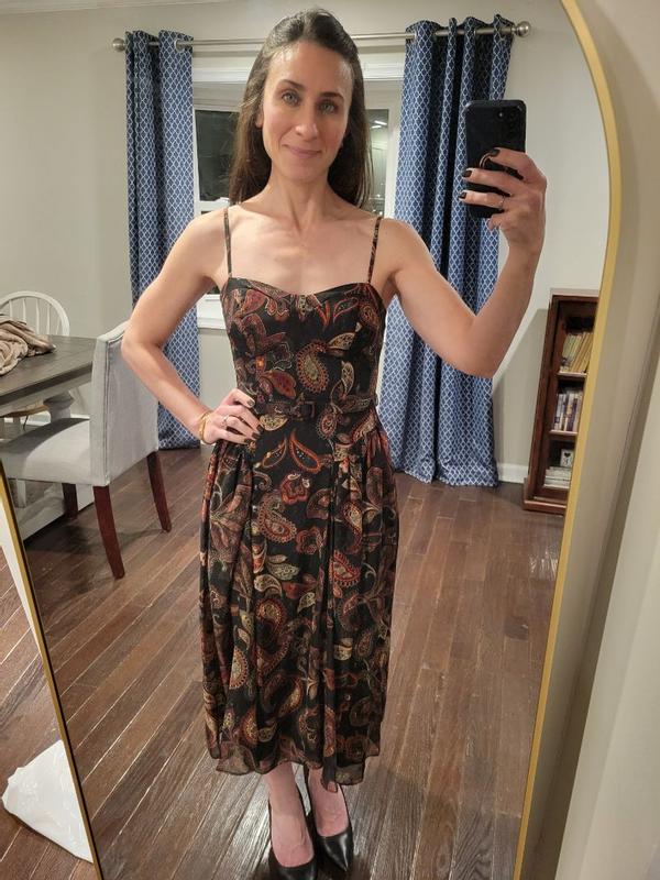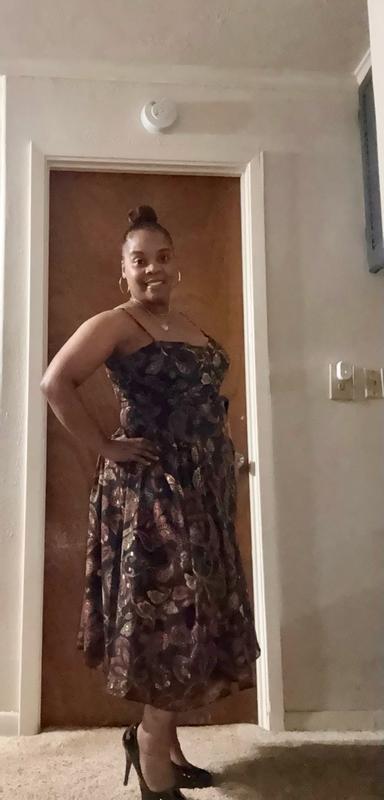 I tried on this dress and honestly, I felt so pretty in it. The print is a little darker than I’m used to but it’s perfect for a night out in the fall season ,it has this rich, elegant mix of colors that makes the whole outfit look dressed up without being “too much.” The fit is flattering, very true to size especially around the waist and bust. It gives shape without feeling tight or uncomfortable. I like that I can wear it with a blazer for a more polished look or just the straps if I want something softer and more feminine. And with heels? It definitely gives a classy vibe. My only small note is that the material feels a little on the lighter side, so depending on the event or weather, you might want a jacket like I did. But overall it’s elegant, comfortable, and makes me feel confident. It’s a yes from me.