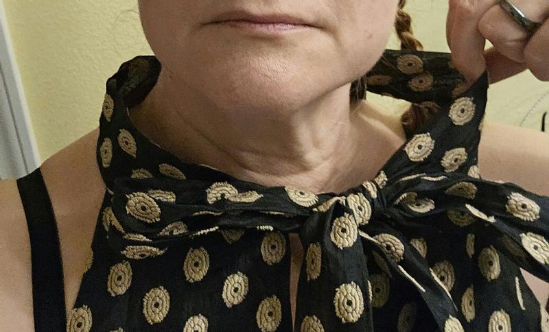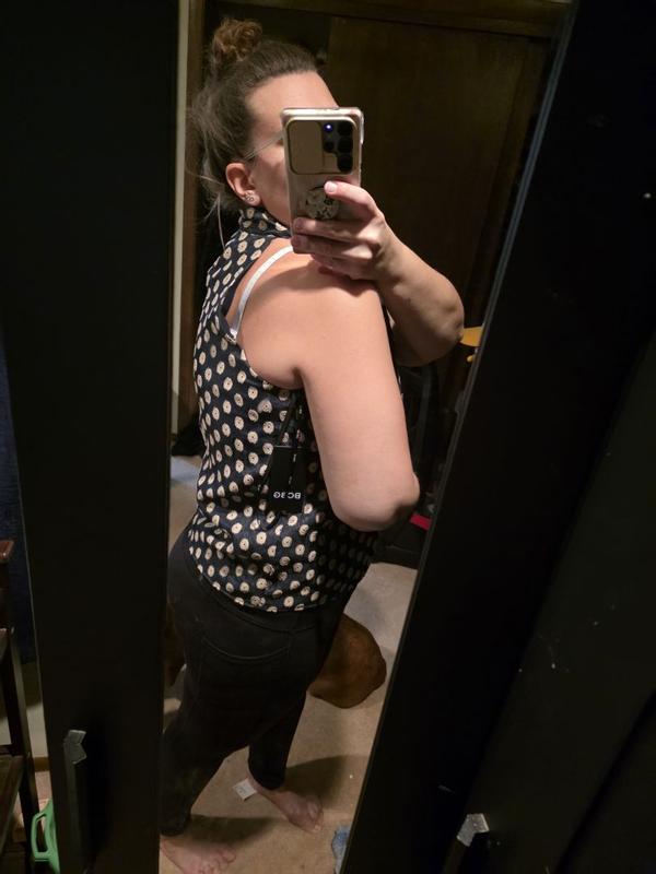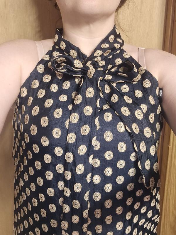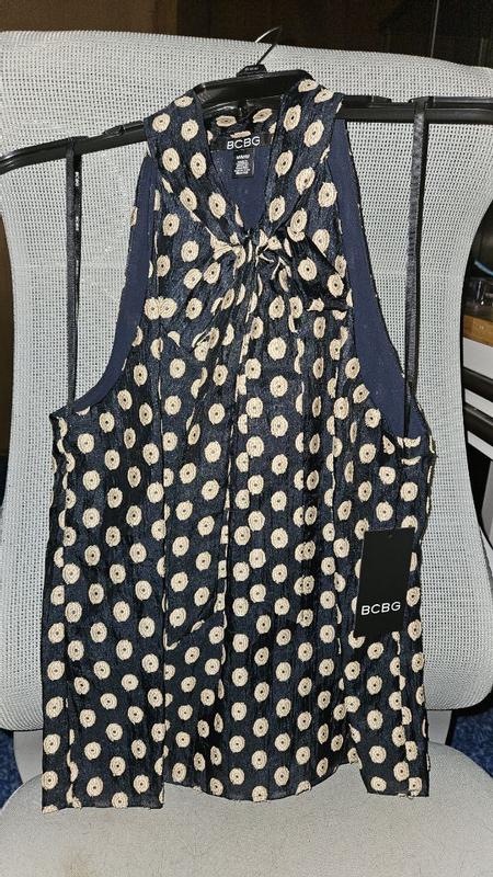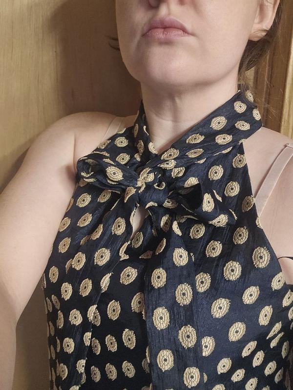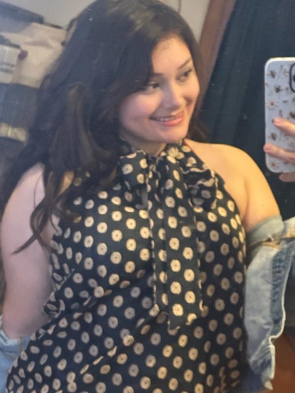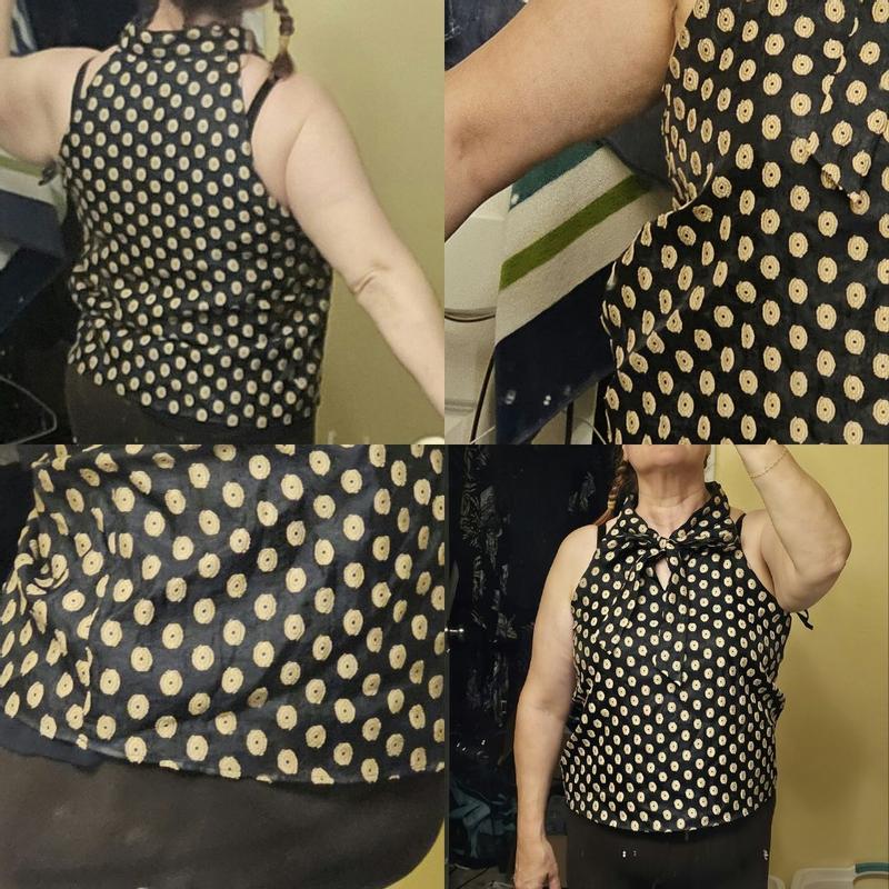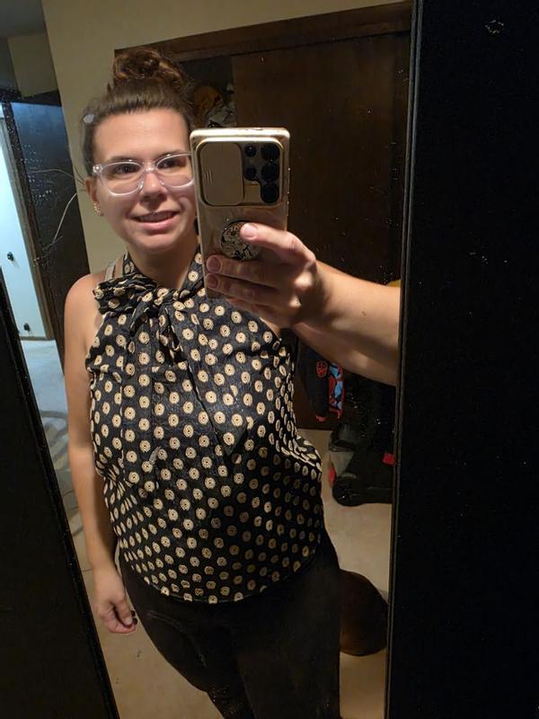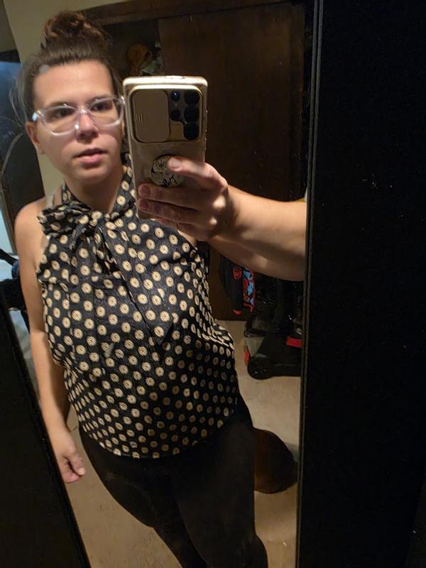 This shirt is soo beautiful. The fabric is amazing and doesn’t feel scratchy. Fabric also feels strong. This is a medium and it fit perfectly, not too tight not too lose. You do need to untie the bow to get your head through, which is fine with me. Overall this is a good shirt to wear to work, or to an event. Again it’s so beautiful and it is sleeveless which is sooo cute to me.
