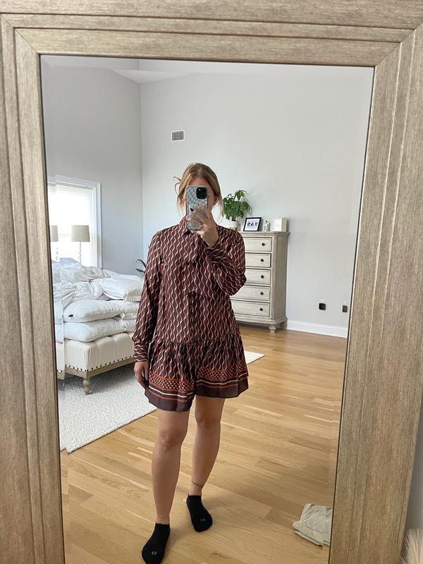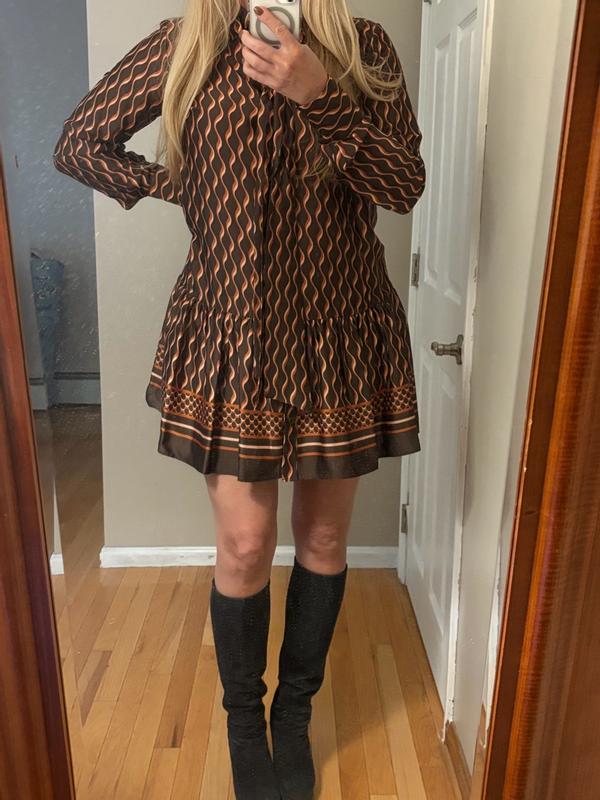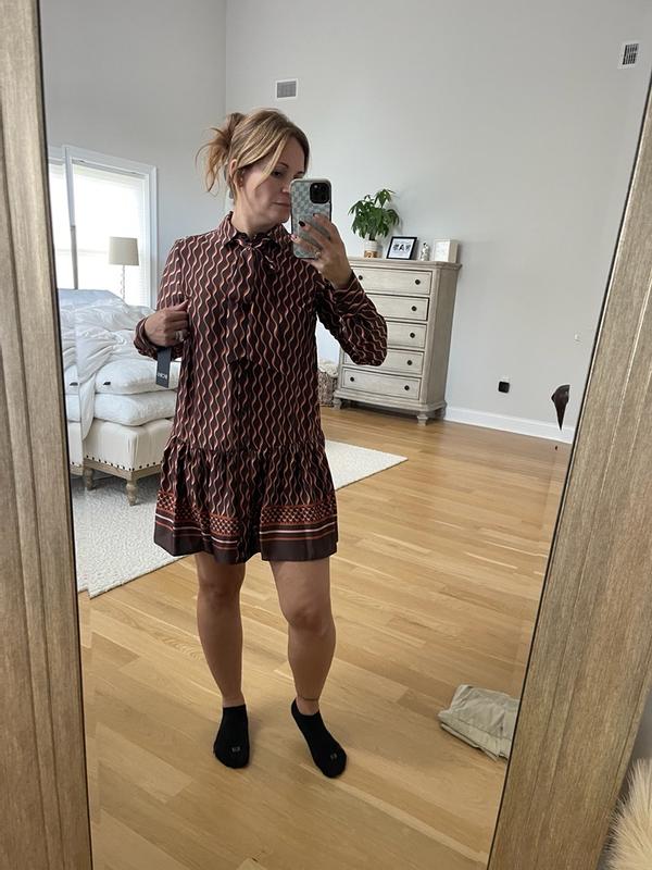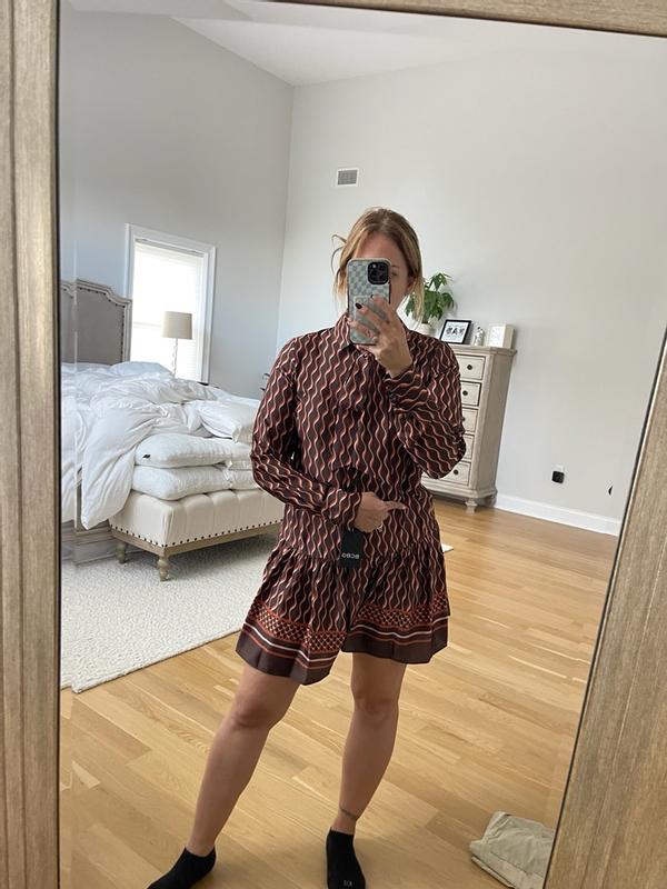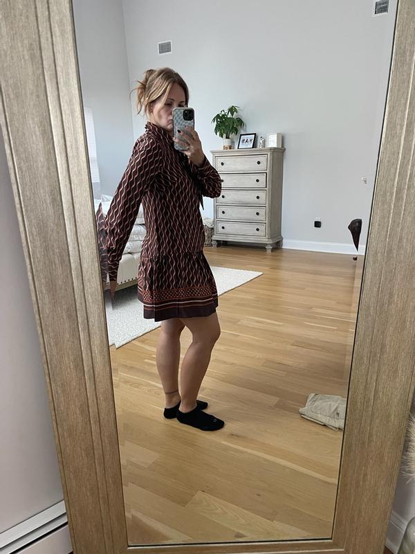 Great fitting dress, I sized down to a 4 which fits well, but is a little short probably because of my height. Would recommend going down a size (taking height out of the equation). Great print, versatile color and pattern- the perfect dress for fall!