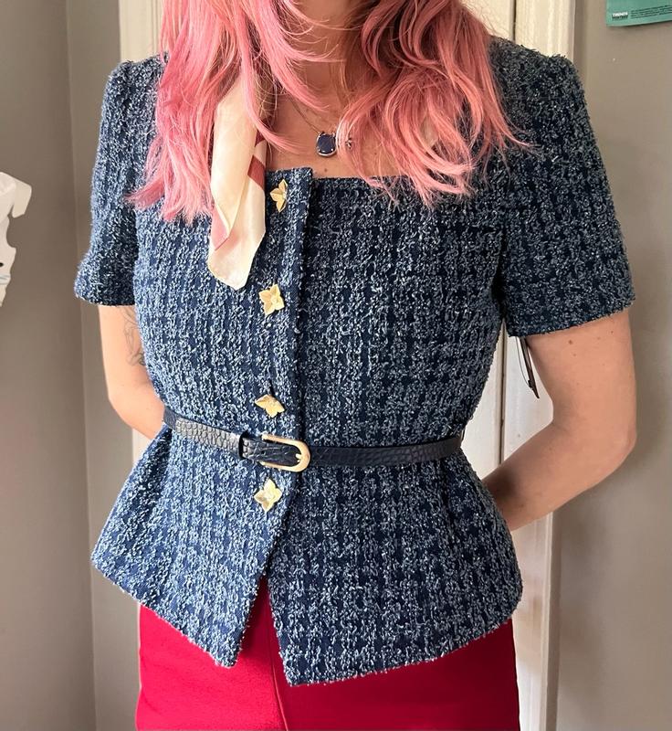 Beautiful jacket! Love the button detail. My only complaint is that the belt that comes with it was too small for me (but I can just wear another belt with it). I bought the matching skirt as well, but the top also looks great when paired with dark skinny jeans!