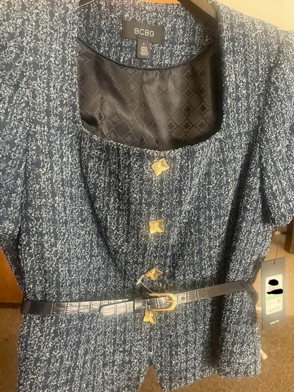 This jacket has an amazing fit with really great quality. 100% cotton but looks a bit like tweed which I love. Love the accents on the buttons and could do with or without the belt. Have always loved the BCBG brand.