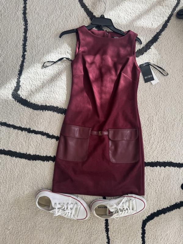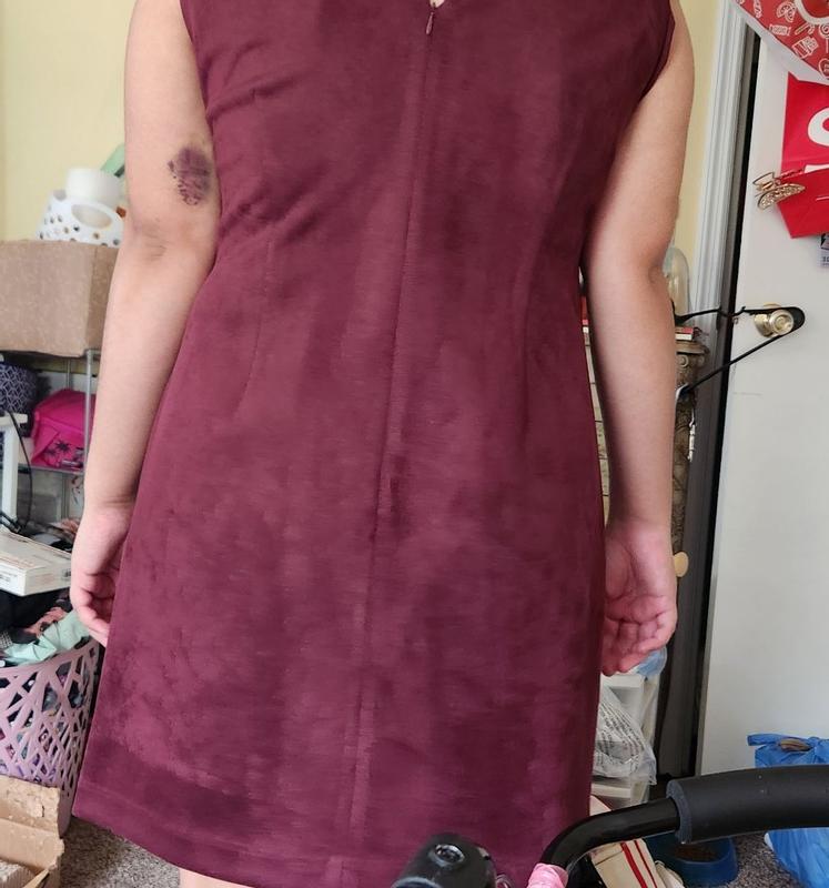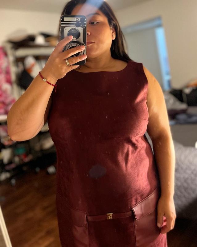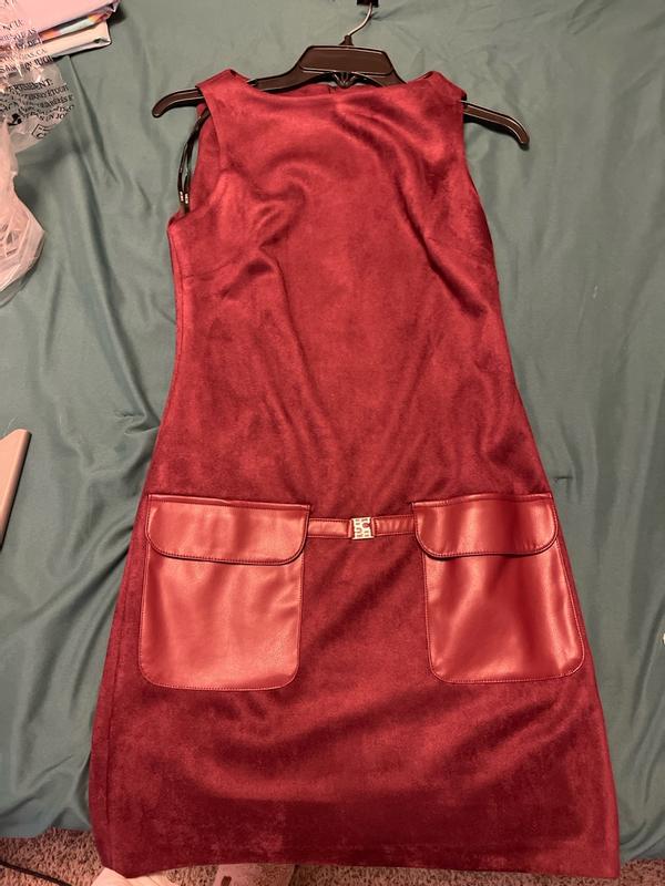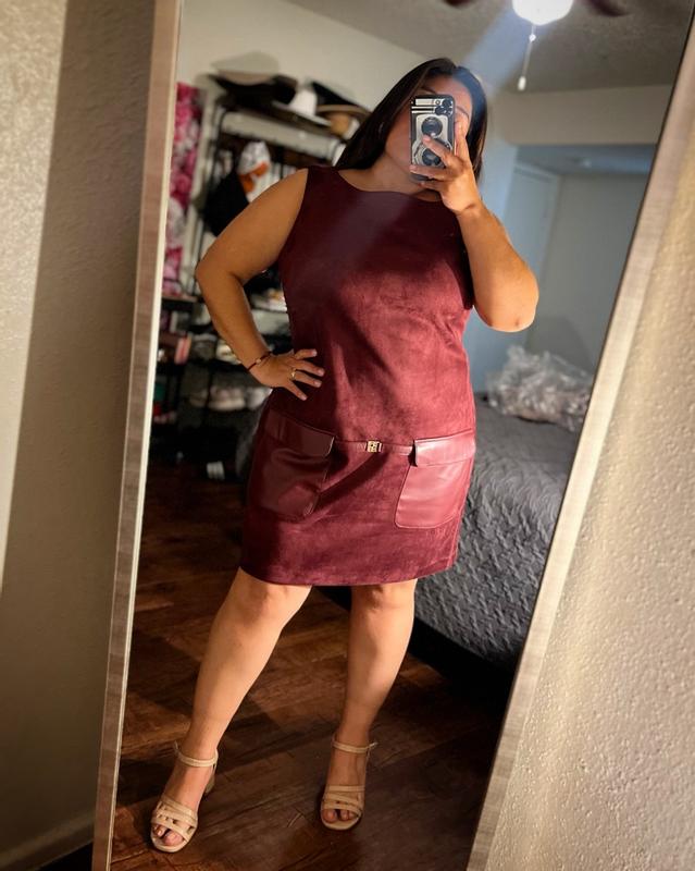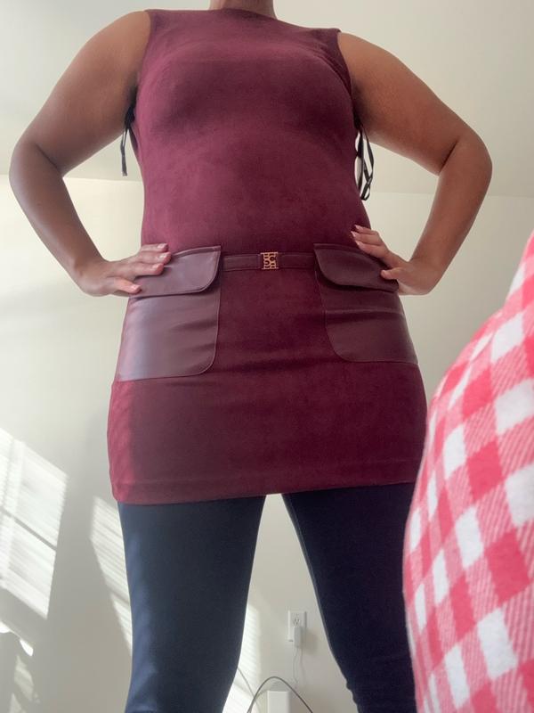 This dress is absolutely stunning. The suede and leather detail is so on trend and the deep burgundy maroon is such a beautiful color for fall love pairing it with a pair of tights and boots for a cute cozy fall outfit not to mention the quality is amazing.