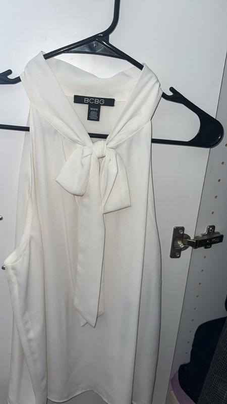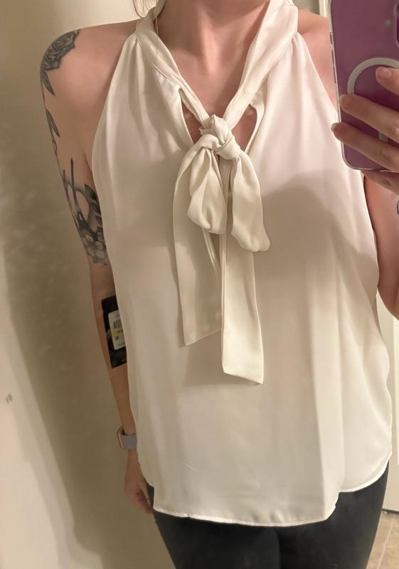Super cute, bow top! Could easily be worn for work or for a nice evening out. I would say fits true to size, wearing a medium, only slightly large on a small bust. Nice lightweight fabric that would be great for layering or wearing during warmer weather.