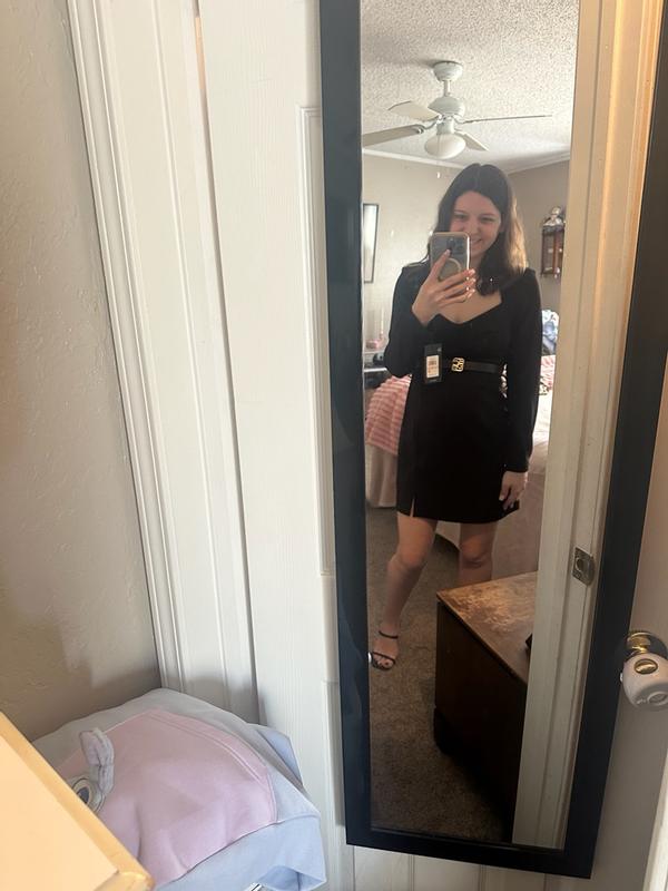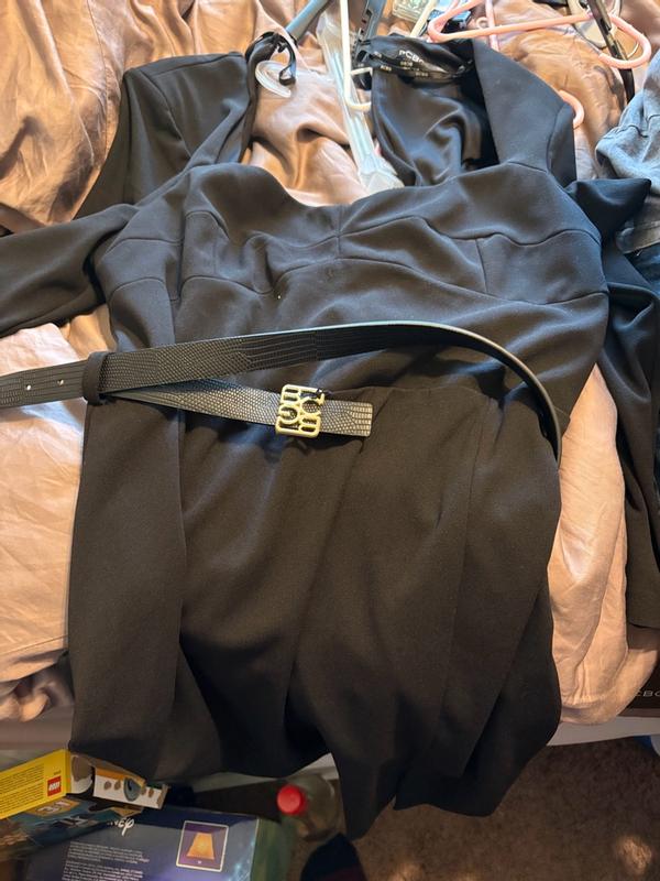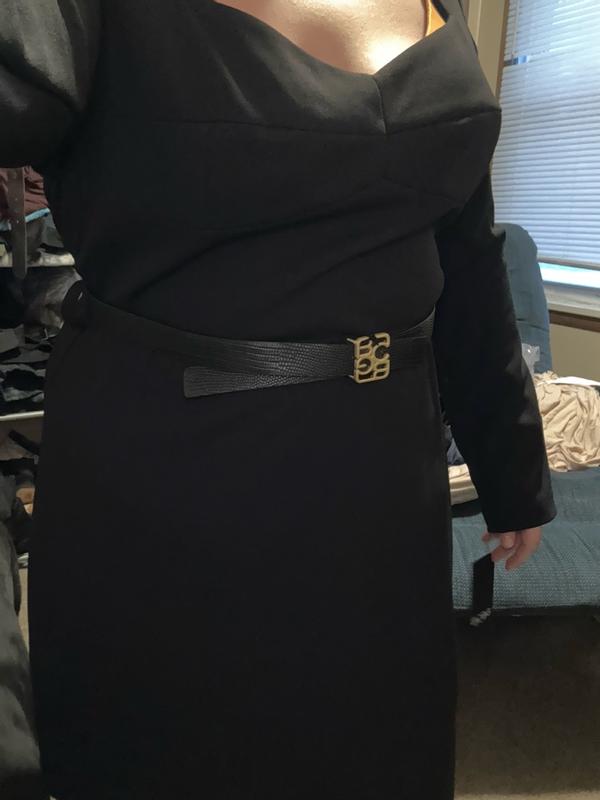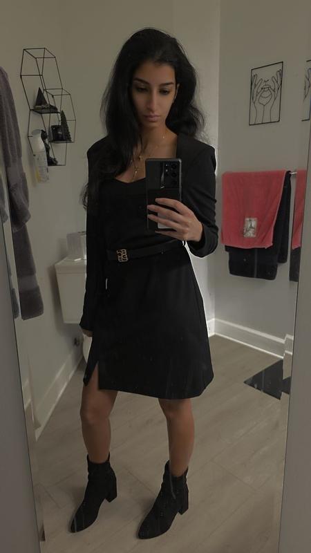 This dress looks so elegant. It is a bit baggy on me but not too much. The style is so chic. The fabric is thick and the belt looks so nice. Wore it with boots it would also look nice with open heeels.