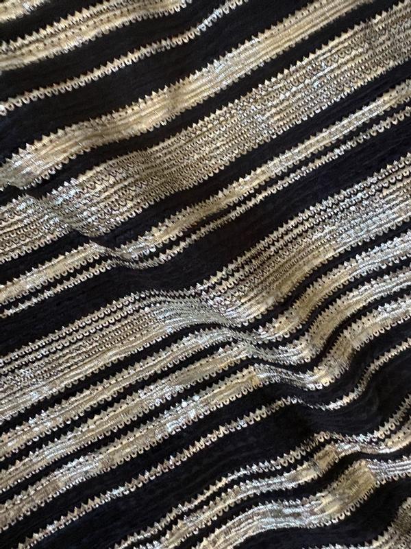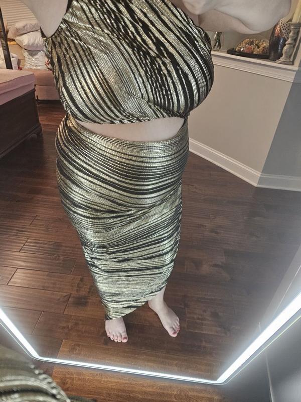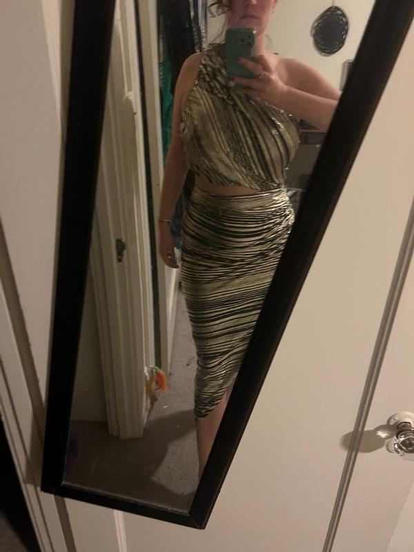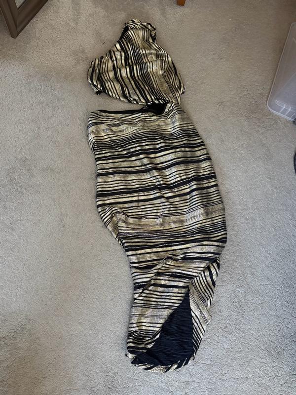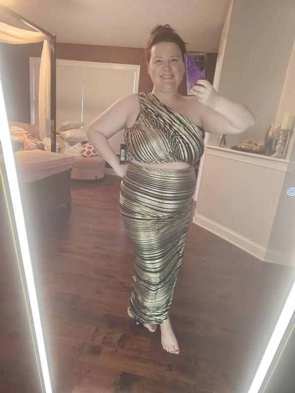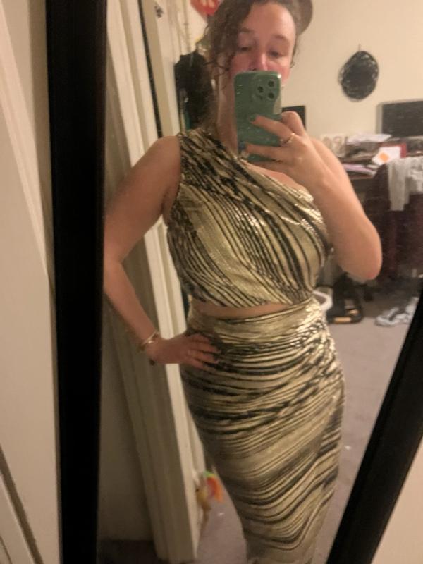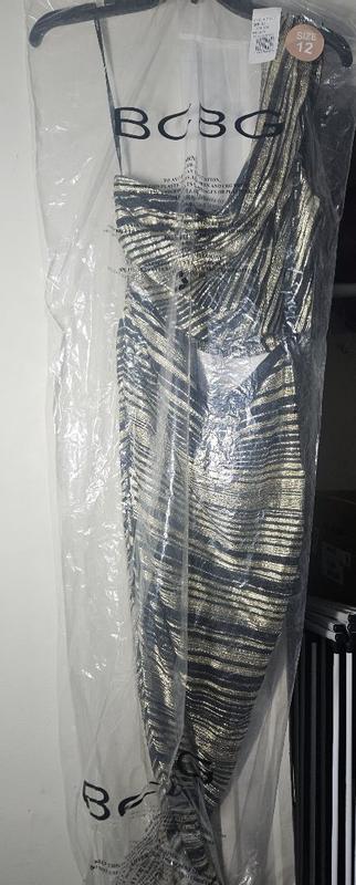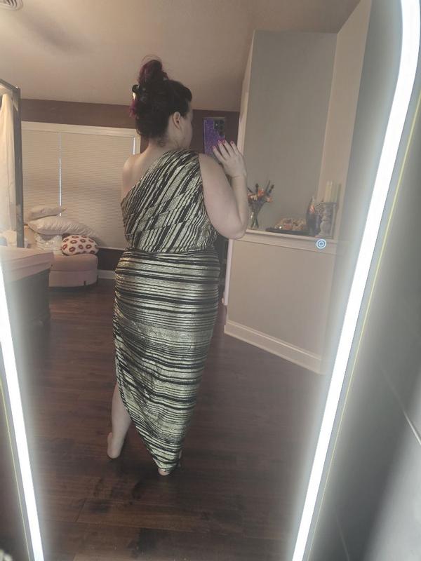 How can I describe to thee my love for the BCBG Women's Striped Asymmetrical One Shoulder Midi Dress? The fit and fabric are beyond comfortable. True to size with some wiggle room as I definitely am nursing a food baby this week. The dress is adequate over my larger than DD chest. The sewn-in liner goes down to a little above the knee. I'm 5'3 and could wear this dress with anything from a small heel on up. Just absolutely gorgeous and made me feel so stylish and sexy. A nice lighter weight fabric so you won't overheat. Perfect celebration and evening attire, would even be great for a night out at a resort. No sequins to get snagged on other fabric. An incredibly lovely addition to my wardrobe.