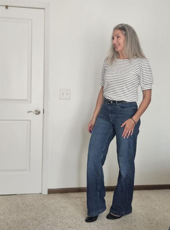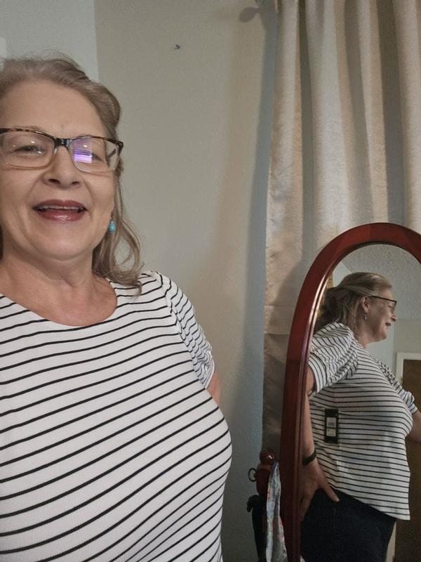 I love the style it has an elastic detail on each side l so it does not make you look wide. I know a lot of people stay away from stripes but I love it and it's so soft.