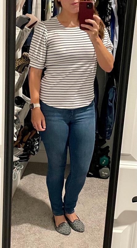 This top is really cute, I love a basic short sleeve shirt that can be worn alone or paired with a jacket/cardigan/blazer and create a totally different look. The style is classic with a little twist of the cuff around the sleeve which adds a little volume in the sleeve. The material is soft and washes nicely and seems durable.