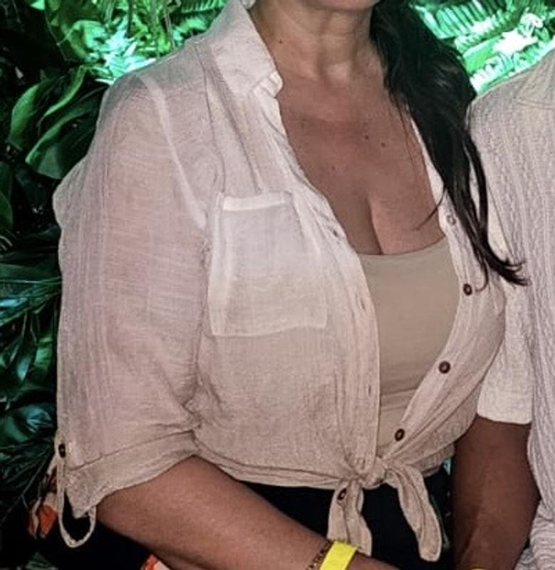 It is a very casual blouse that I bought to go with similar color Palazzo pants, I also wore a white silky tank top under the blouse. RIt was a nice outfit that I wore to my granddaughter's graduation last week. I did not tie up the front in a bow, I should have.