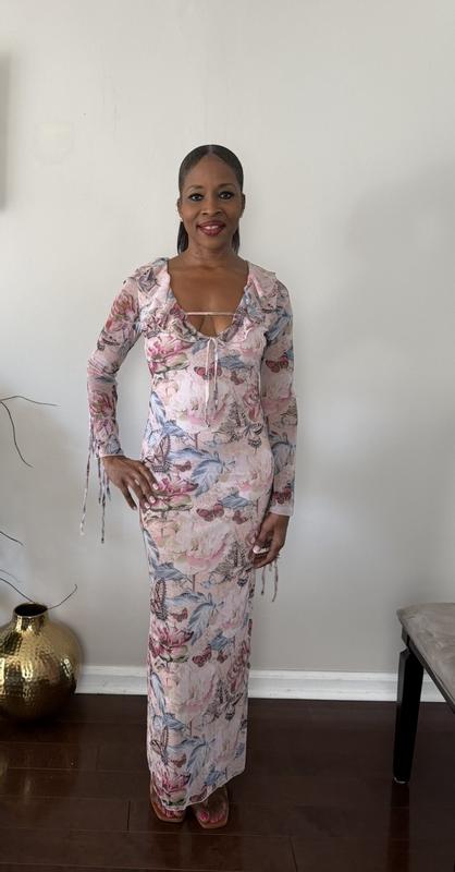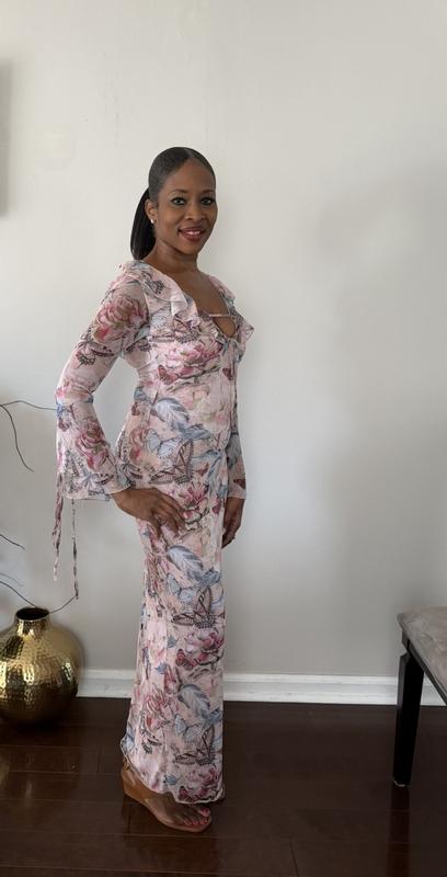 The Bebe Women's Long Sleeve Ruffle Neck Maxi Dress combines elegance and style with its flowing silhouette and sophisticated ruffle detailing around the neckline.