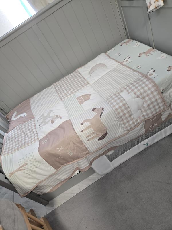 The colors are even cuter in person—soft, neutral tones that work for both boys and girls. The fabric is breathable and held up well after washes; no fading or pilling. The quilt is lightweight but cozy, and the fitted sheet fits the mattress snugly. The whole set gives the nursery such a sweet, peaceful farm vibe. Offered by lambsivy.