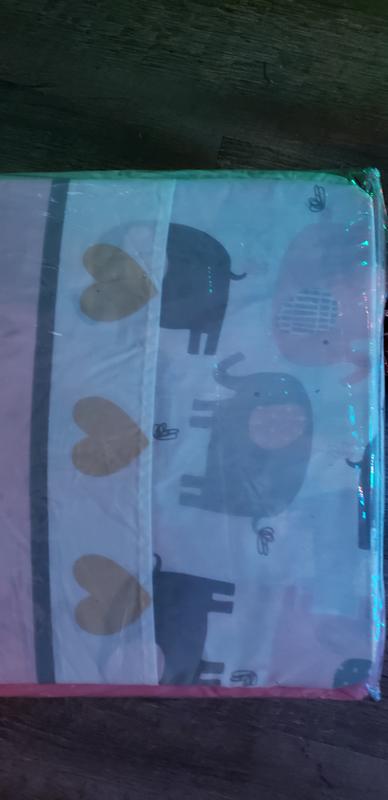 This is an adorable crib set which features a fitted sheet, a crib skirt and comforter. The elephants, hearts, flowers, colors and background patterns are lovely to look at. It is soft, yet durable and a special addition to the sweetest looking nursery ever. Recommended!