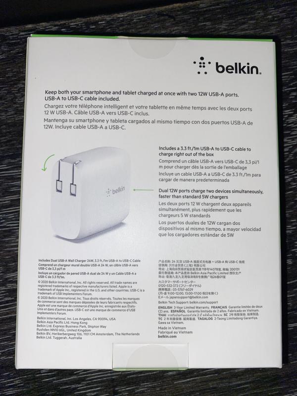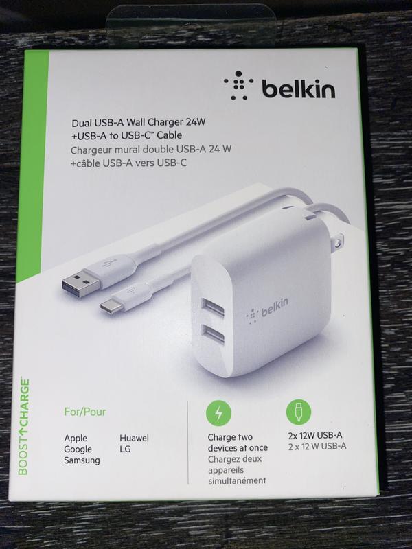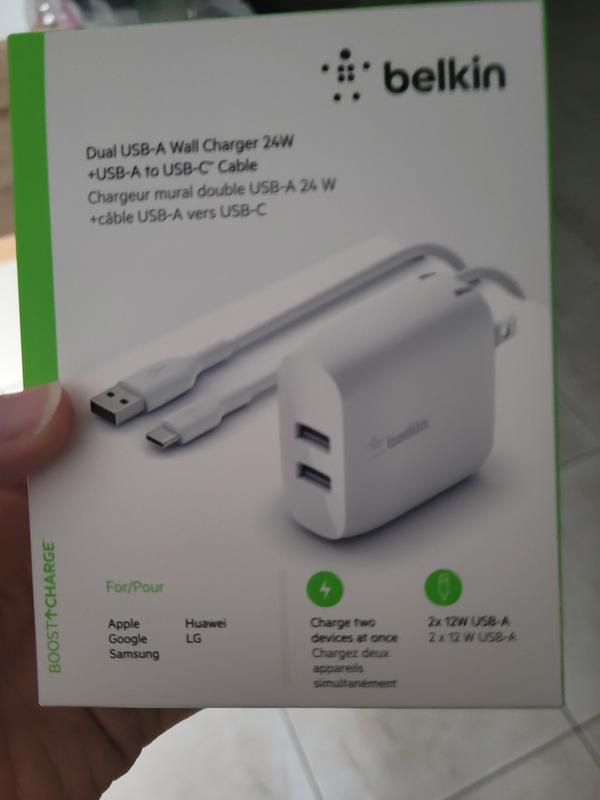 Love my new Belkin International - BOOST↑CHARGE™ Dual USB-A Wall Charger 24W + USB-A to USB-C® cable! Works really well! Quick charging and can plug my tablet and phone in at the same time! Love the white type C phone charger cord, can easily distinguish phone cord from a black cord in the dark! Good craftsmanship with plug and cord. Cord has a heavy duty feel to it. I am absolutely thrilled with this product, 5 stars!