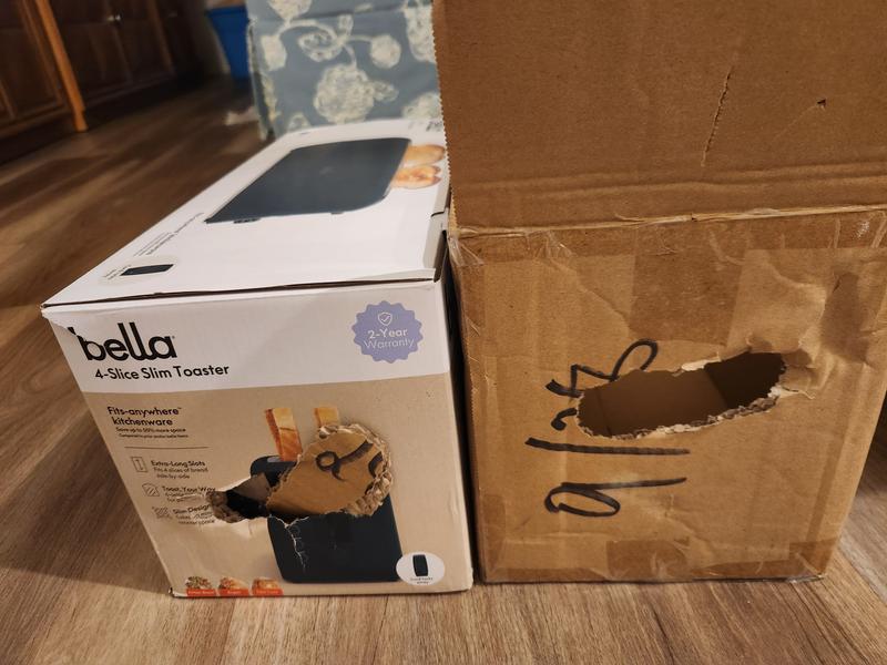The box on the outside had a hole in it, the box for the toaster itself had a hole in it. The back of the toaster was smashed in and damaged badly. I am not happy with the purchase as it is unusable to me now. I cannot give a rating since I was unable to use this product and it is not the sellers fault. It is the shipping that damaged the produce that is the only reason I have to give it a low rating otherwise the product is very nice.